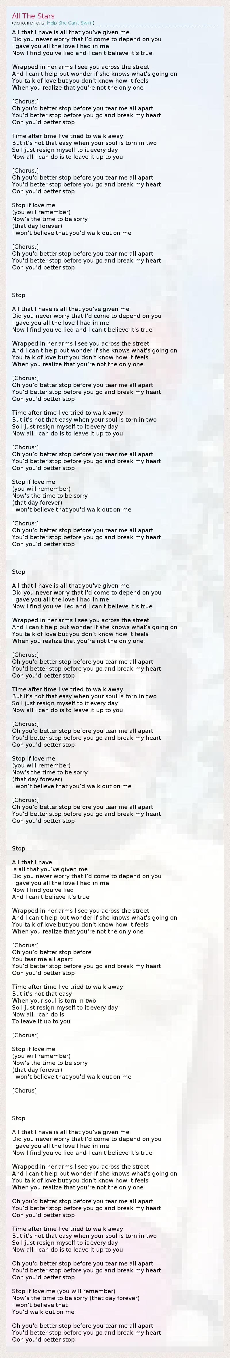 Все, что у меня есть, это то, что дал мне ты, Ты когда-нибудь думал о том, что я впаду в зависимость от тебя? Я отдала тебе всю любовь, на которую была способна, А теперь оказалось, что ты лгал мне, и я не могу в это поверить. Я вижу тебя на улице в ее объятиях, И мне интересно, знает ли она, что происходит? Ты говоришь о любви, но на самом деле ты не представляешь, Каково это - ощущать себя обманутой. [Припев:] Остановись, пока ты не разорвал мою душу на части, Остановись, пока ты не разбил мне сердце, Остановись! Я не раз хотела уйти, Но это не так-то просто, когда твоя душа рвётся на части. Так что я просто каждый день смиряюсь с этим, И сейчас всё, что я могу сделать, - это оставить решение за тобой. [Припев:] Остановись, пока ты не разорвал мою душу на части, Остановись, пока ты не разбил мне сердце, Остановись! Остановись, если любишь меня! (ты запомнишь...) Настала пора просить прощения (этот день на всю жизнь) Я не верю в то, что ты гулял от меня... [Припев:] Остановись, пока ты не разорвал мою душу на части, Остановись, пока ты не разбил мне сердце, Остановись! Остановись (перевод Юрий Бардин из Москвы) Всё, чем богата – (всё) даровал мне ты, Как же ты не думал, что я стану КАК ТЫ ВТОРОЙ…? Я отдала тебе (всю) любовь мою, А ты смеялся, находясь с другой... В её объятьях на бульваре грёз... ((И мне так интересно – прозревает ли она??)) - Ты о любви готов твердить до слёз – Твоих коварных, и моих – от осознанья дна... O-o-o-о... [Припев:] Ты лучше "СТОП" скажи своим бесплодным снам, Остановись!, а то сердца – напополам... У-у-у-у-у, остановись! Не раз, не два, пыталась я уйти, Но то – не просто, коль душа разорена. Я лишь смиряюсь с тем на каждый день И на сегодня – за тобой судьбы струна... О-о-о-о... [Припев:] Ты лучше "СТОП" скажи своим бесплодным снам, Остановись!, а то сердца – напополам... У-у-у-у-у, остановись! "СТОП" - если любишь, (ты должен помнить...) Это шанс – для прощенья... (И шанс на вечность) - Я не поверю, что в забвении я... [Припев:] О, Ты лучше "СТОП" скажи своим колючим снам, Остановись, а то сердца – напополам... У-у-у-у-у, остановись! Шанс (перевод Юрий Бардин из Москвы) Я возрождаюсь от Любви Твоей! Сомнений всплески поглотИт глоток (бокал) вина... Ты в нём как в море (Небе) растворись скорей... И я всё выпью до сухого дна!!! Не надо больше бесполезных слов - И без того всё славно в аромате дивных грёз! О-о, На ставнях сердца отведу засов! И утону в (Твоей) Любви и Океане (тихих) слёз... О-о-о-о... [Припев:] И дай мне ШАНС понять, где хочешь Ты пройти, И я пойду к Тебе, по Млечному Пути!!! У-у-у-у-у, дай шанс понять...! Не раз, не два, пыталась я уйти... Но то – не просто, коль душа Тобой полна... Я вдохновляюсь тем на каждый день... И на сегодня – за Тобой Любви Струна... О-о-о-о... [Припев:] И дай мне ШАНС понять, где хочешь Ты пройти, И я пойду к Тебе, по Млечному Пути!!! У-у-у-у-у, дай шанс понять...! ДАЙ! (ШАНС) - если любишь, (ты же всё помнишь...) Это шанс – для прощенья... (И шанс на вечность) - Я не поверю, что в забвении я.. [Припев:] И дай мне ШАНС понять, где хочешь Ты пройти, И я пойду к Тебе, по Млечному Пути!!! У-у-у-у-у, пойду к Тебе..! Постой! (перевод Елена Васильева из Костромы) Здесь все, что есть, что я имею. Всего добилась с помощью твоею. Но так зависеть не могу, Тебе себя отдав с избытком. Ты лгал. Зачем? Я не пойму. Поверила тебе – вот где ошибка. И обнимаясь с ней, ты вдоль по улице идешь. Пусть трудно мне сдержаться. Но вряд ли ты сейчас поймешь,