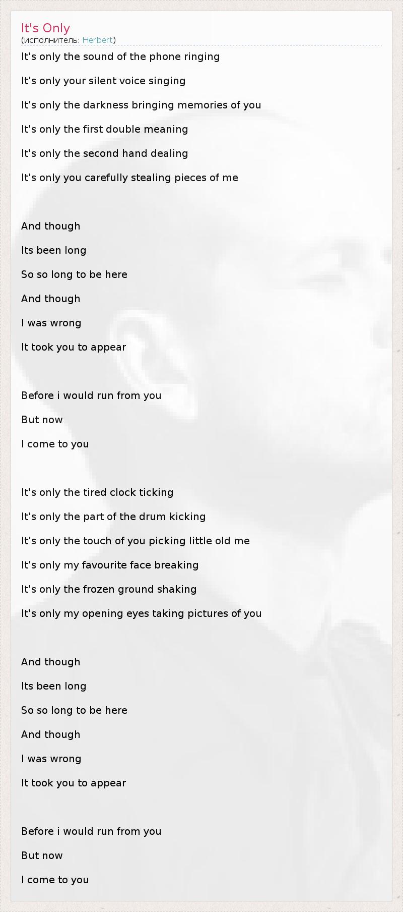 It's only the sound of the phone ringing It's only your silent voice singing It's only the darkness bringing memories of you It's only the first double meaning It's only the second hand dealing It's only you carefully stealing pieces of me And though Its been long So so long to be here And though I was wrong It took you to appear Before i would run from you But now I come to you It's only the tired clock ticking It's only the part of the drum kicking It's only the touch of you picking little old me It's only my favourite face breaking It's only the frozen ground shaking It's only my opening eyes taking pictures of you And though Its been long So so long to be here And though I was wrong It took you to appear Before i would run from you But now I come to you