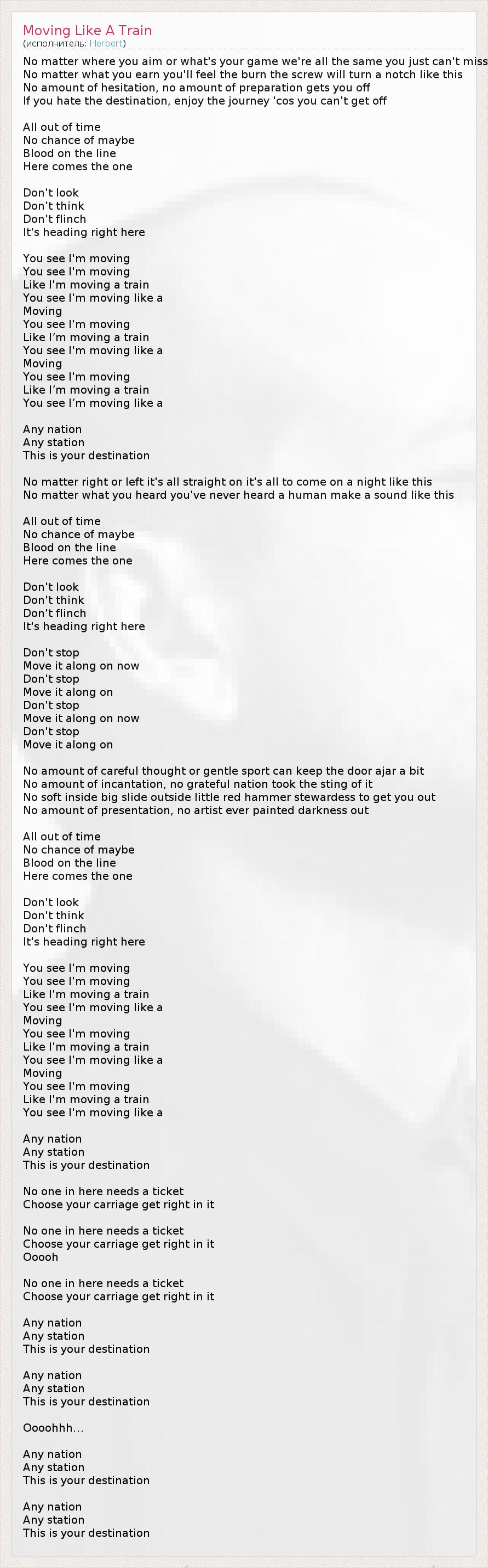 No matter where you aim or what's your game we're all the same you just can't miss No matter what you earn you'll feel the burn the screw will turn a notch like this No amount of hesitation, no amount of preparation gets you off If you hate the destination, enjoy the journey 'cos you can't get off All out of time No chance of maybe Blood on the line Here comes the one Don't look Don't think Don't flinch It's heading right here You see I'm moving You see I'm moving Like I'm moving a train You see I'm moving like a Moving You see I'm moving Like I’m moving a train You see I'm moving like a Moving You see I'm moving Like I’m moving a train You see I’m moving like a Any nation Any station This is your destination No matter right or left it's all straight on it's all to come on a night like this No matter what you heard you've never heard a human make a sound like this All out of time No chance of maybe Blood on the line Here comes the one Don't look Don't think Don't flinch It's heading right here Don't stop Move it along on now Don't stop Move it along on Don't stop Move it along on now Don't stop Move it along on No amount of careful thought or gentle sport can keep the door ajar a bit No amount of incantation, no grateful nation took the sting of it No soft inside big slide outside little red hammer stewardess to get you out No amount of presentation, no artist ever painted darkness out All out of time No chance of maybe Blood on the line Here comes the one Don't look Don't think Don't flinch It's heading right here You see I'm moving You see I'm moving Like I'm moving a train You see I'm moving like a Moving You see I'm moving Like I'm moving a train You see I'm moving like a Moving You see I'm moving Like I'm moving a train You see I'm moving like a Any nation Any station This is your destination No one in here needs a ticket Choose your carriage get right in it No one in here needs a ticket Choose your carriage get right in it Ooooh No one in here needs a ticket Choose your carriage get right in it Any nation Any station This is your destination Any nation Any station This is your destination Oooohhh… Any nation Any station This is your destination Any nation Any station This is your destination