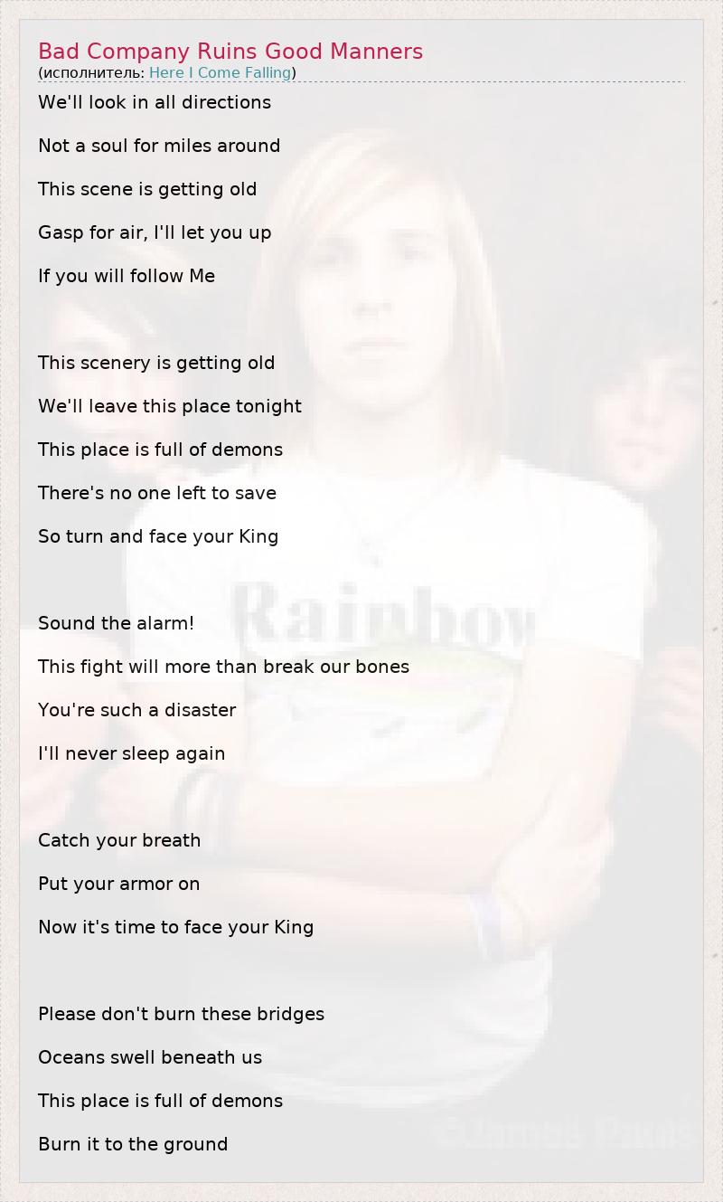 ГлавнаяИсполнителиHere I Come FallingBad Company Ruins Good Manners