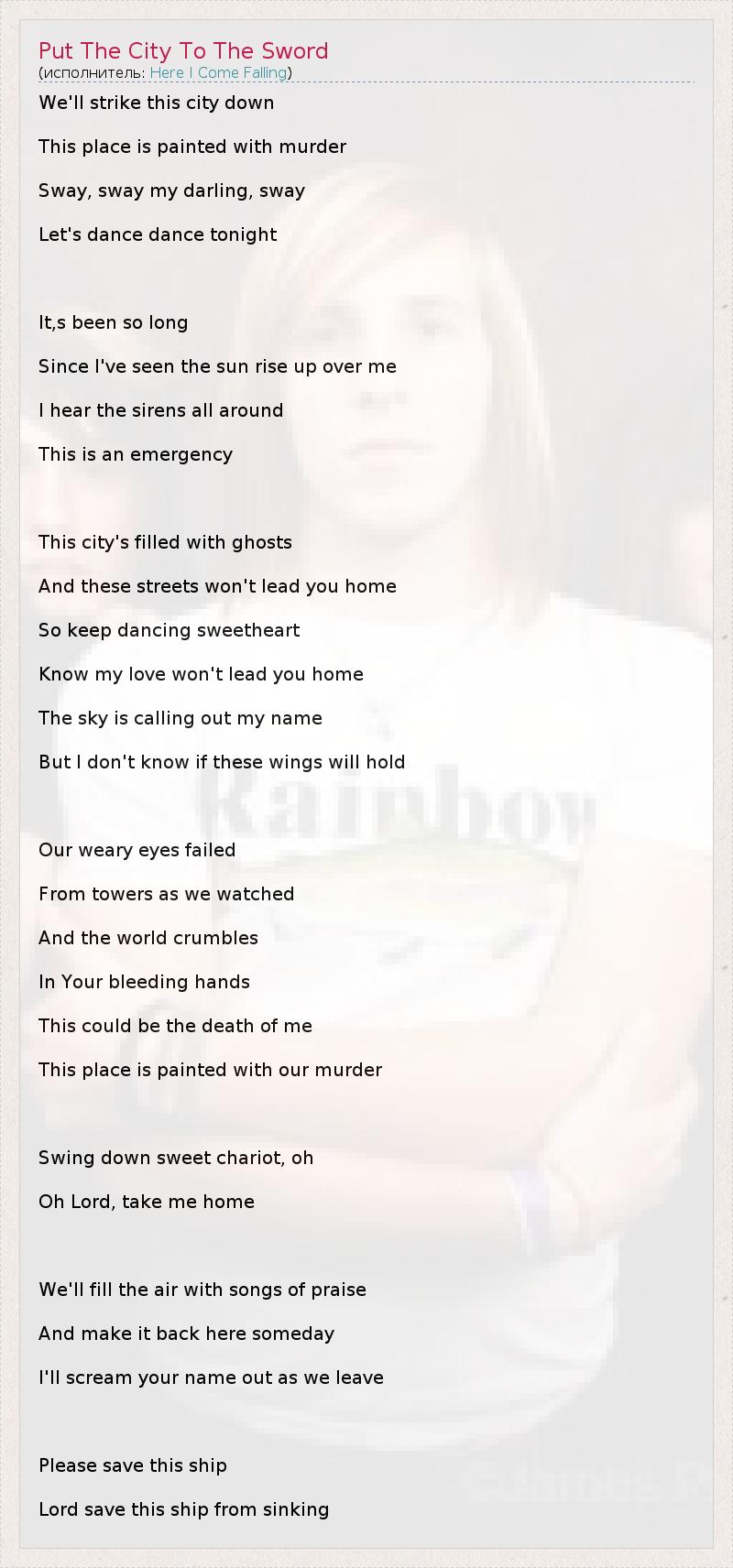 We'll strike this city down This place is painted with murder Sway, sway my darling, sway Let's dance dance tonight It,s been so long Since I've seen the sun rise up over me I hear the sirens all around This is an emergency This city's filled with ghosts And these streets won't lead you home So keep dancing sweetheart Know my love won't lead you home The sky is calling out my name But I don't know if these wings will hold Our weary eyes failed From towers as we watched And the world crumbles In Your bleeding hands This could be the death of me This place is painted with our murder Swing down sweet chariot, oh Oh Lord, take me home We'll fill the air with songs of praise And make it back here someday I'll scream your name out as we leave Please save this ship Lord save this ship from sinking