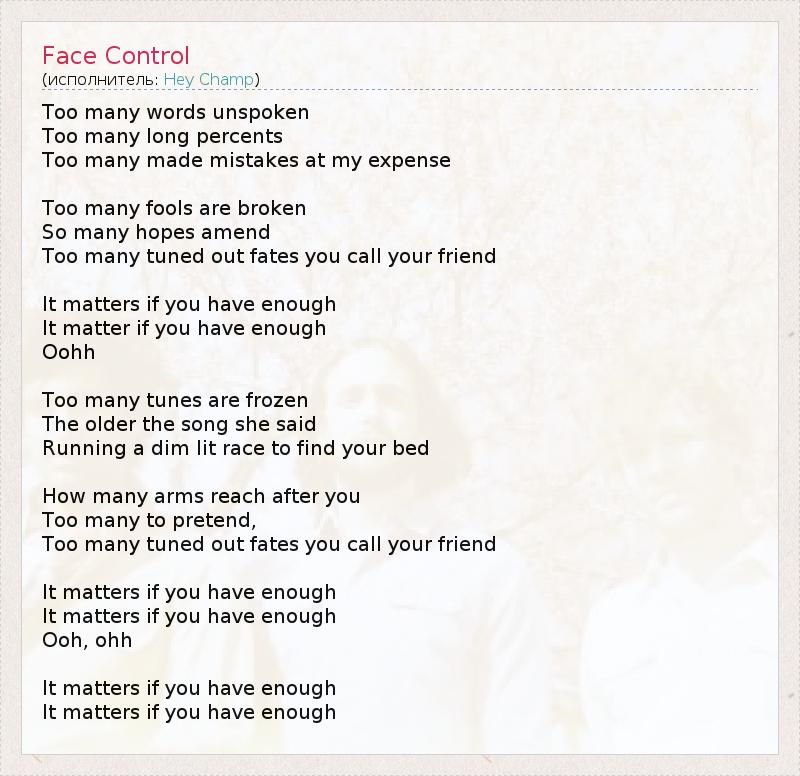 Too many words unspoken Too many long percents Too many made mistakes at my expense Too many fools are broken So many hopes amend Too many tuned out fates you call your friend It matters if you have enough It matter if you have enough Oohh Too many tunes are frozen The older the song she said Running a dim lit race to find your bed How many arms reach after you Too many to pretend, Too many tuned out fates you call your friend It matters if you have enough It matters if you have enough Ooh, ohh It matters if you have enough It matters if you have enough