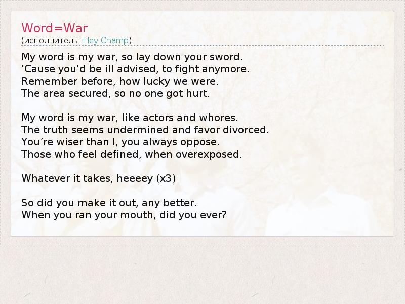 My word is my war, so lay down your sword. 'Cause you'd be ill advised, to fight anymore. Remember before, how lucky we were. The area secured, so no one got hurt. My word is my war, like actors and whores. The truth seems undermined and favor divorced. You’re wiser than I, you always oppose. Those who feel defined, when overexposed. Whatever it takes, heeeey (x3) So did you make it out, any better. When you ran your mouth, did you ever?