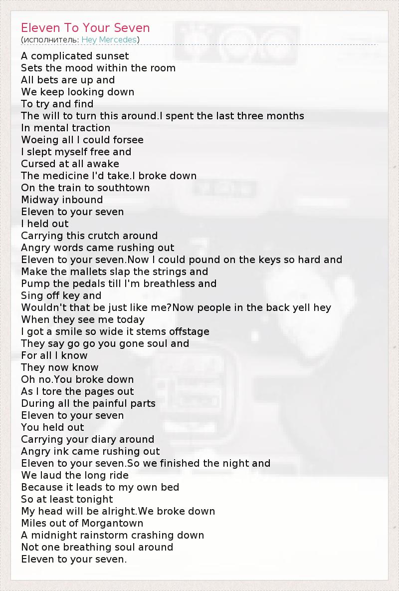 A complicated sunset Sets the mood within the room All bets are up and We keep looking down To try and find The will to turn this around.I spent the last three months In mental traction Woeing all I could forsee I slept myself free and Cursed at all awake The medicine I'd take.I broke down On the train to southtown Midway inbound Eleven to your seven I held out Carrying this crutch around Angry words came rushing out Eleven to your seven.Now I could pound on the keys so hard and Make the mallets slap the strings and Pump the pedals till I'm breathless and Sing off key and Wouldn't that be just like me?Now people in the back yell hey When they see me today I got a smile so wide it stems offstage They say go go you gone soul and For all I know They now know Oh no.You broke down As I tore the pages out During all the painful parts Eleven to your seven You held out Carrying your diary around Angry ink came rushing out Eleven to your seven.So we finished the night and We laud the long ride Because it leads to my own bed So at least tonight My head will be alright.We broke down Miles out of Morgantown A midnight rainstorm crashing down Not one breathing soul around Eleven to your seven.