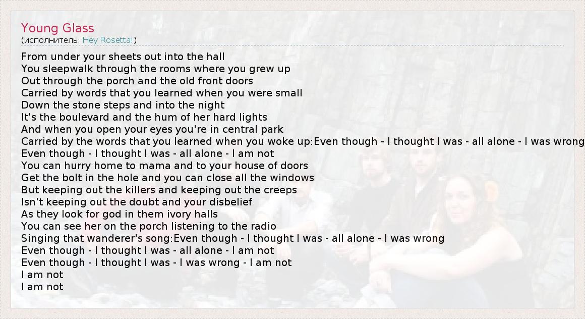 Это интересно:http://www.heyrosetta.com/Hey Rosetta! is a six-piece Canadian indie rock band from St. John's, Newfoundland and Labrador. Known for its energized live shows, the band creates a massive, layered sound by incorporating piano, violin and cello into the traditional four-piece garage rock sound.HistoryTheir influences include The Beatles and Jeff Buckley, while also incorporating the layered production of contemporary indie bands such as Arcade Fire and Hope of the States.The band earned acclaim at the 2006 MusicNL awards, taking home the awards for Group of the Year, Pop/Rock Group of the Year, CBC Galaxie Rising... продолжение
