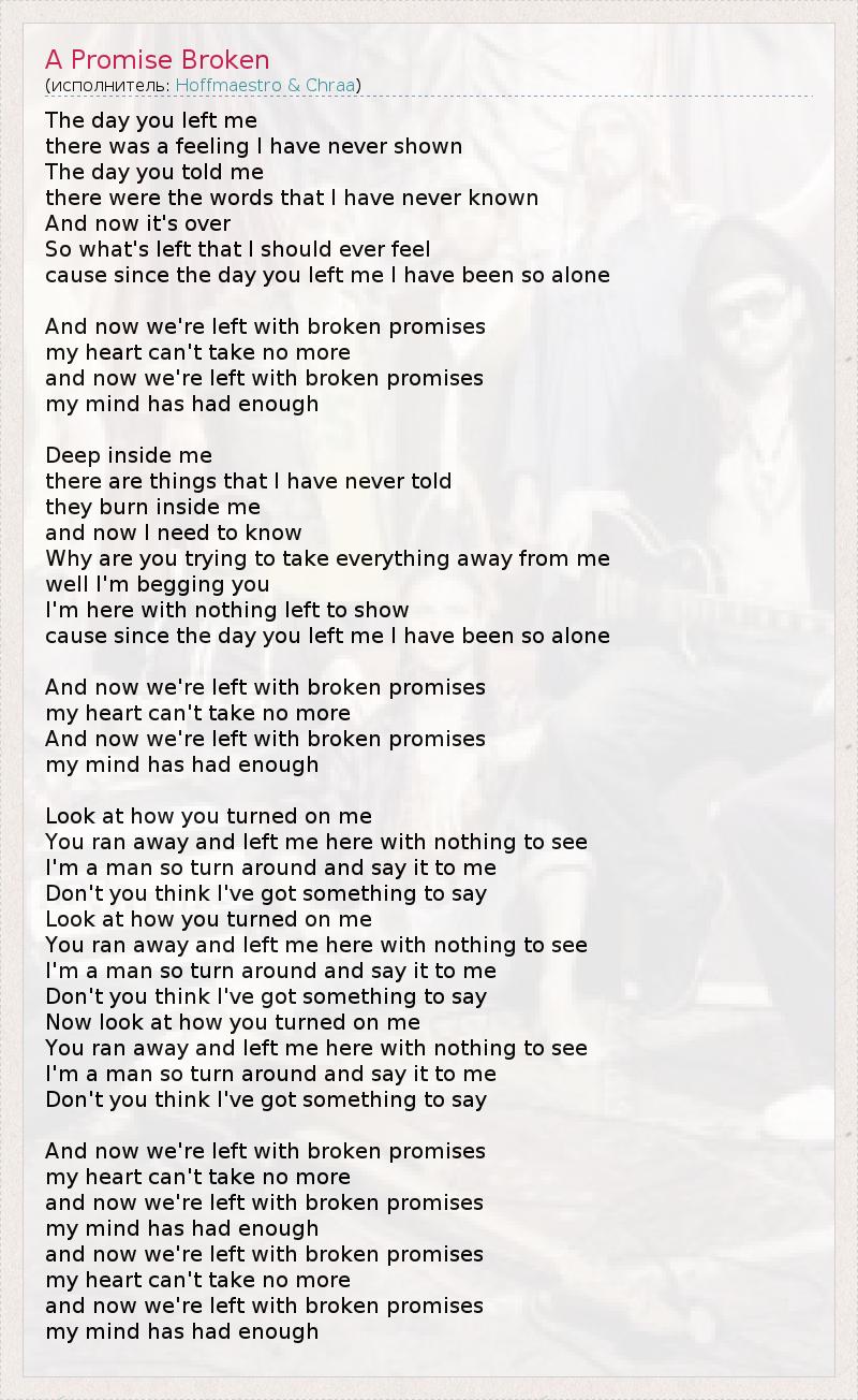 The day you left me there was a feeling I have never shown The day you told me there were the words that I have never known And now it's over So what's left that I should ever feel cause since the day you left me I have been so alone And now we're left with broken promises my heart can't take no more and now we're left with broken promises my mind has had enough Deep inside me there are things that I have never told they burn inside me and now I need to know Why are you trying to take everything away from me well I'm begging you I'm here with nothing left to show cause since the day you left me I have been so alone And now we're left with broken promises my heart can't take no more And now we're left with broken promises my mind has had enough Look at how you turned on me You ran away and left me here with nothing to see I'm a man so turn around and say it to me Don't you think I've got something to say Look at how you turned on me You ran away and left me here with nothing to see I'm a man so turn around and say it to me Don't you think I've got something to say Now look at how you turned on me You ran away and left me here with nothing to see I'm a man so turn around and say it to me Don't you think I've got something to say And now we're left with broken promises my heart can't take no more and now we're left with broken promises my mind has had enough and now we're left with broken promises my heart can't take no more and now we're left with broken promises my mind has had enough