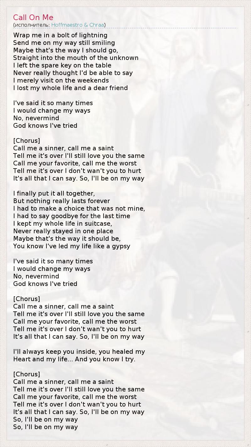 Назови меня Оберни меня в громе молнии Отправь меня в путь, продолжая улыбаться Может, это путь по которому я должен идти? Прямо в лапы незнакомцам Я оставил запасной ключ на столе Никогда бы не подумал, что я мог бы сказать Я просто развлекаюсь на выходных Я потерял целую жизнь и дорогого друга Я повторял так много раз Я изменил бы свои пути Не берите в голову, Только Бог знает, что я пробовал Назови меня грешником, назови меня святым Скажи, что всё кончено, но я также тебя люблю Назови меня самым лучшим, назови плохим Скажи, что всё кончено, я не хочу тебе навредить Это всё, что я могу сказать. Я буду идти своей дорогой Я наконец-то собрал всё вместе Но ничто не длится вечно Я должен сделать чужой выбор Я должен попрощаться в последний раз Я храню всю свою жизнь в чемодане, Никогда не останавливаясь в одном месте Наверное, это мой путь Ты знаешь, я жил как цыган Я повторял так много раз Я изменил бы свои пути Не берите в голову, Только Бог знает, что я пробовал Назови меня грешником, назови меня святым Скажи, что всё кончено, но я также тебя люблю Назови меня самым лучшим, назови плохим Скажи, что всё кончено, я не хочу тебе навредить Это всё, что я могу сказать. Я буду идти своей дорогой Я всегда буду хранить тебя в себе, ты излечила мои Сердце и мою жизнь… И ты знаешь, я пытаюсь Назови меня грешником, назови меня святым Скажи, что всё кончено, но я также тебя люблю Назови меня самым лучшим, назови плохим Скажи, что всё кончено, я не хочу тебе навредить