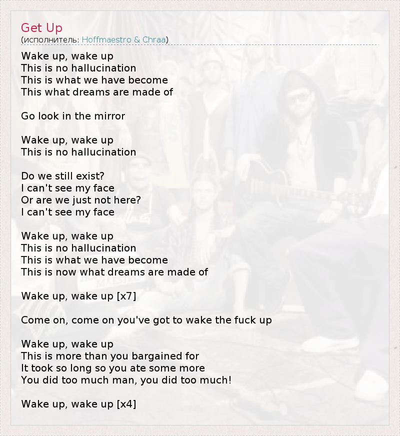 Проснись!Проснись! Это не галлюцинация. Это то, чем мы стали, Это то из чеГо состоят сны. Иди, взгляни в зеркало. Проснись!Проснись! Это не галлюцинация. Мы до сих пор живем, Или мы уже здесь сгнили? Я не вижу своего лица. Проснись!Проснись! Это не галлюцинация. Это то, чем мы стали, Это то из чего состоят сны. Проснись!(х8) Давай!Давай! Блядь!Ты должен проснуться! Проснись!Проснись! Это больше чем ты хотел. Это слишком долго и ты сгнил немного больше. Ты принял слишком много, чувак. Ты принял слишком много. Проснись!Проснись!