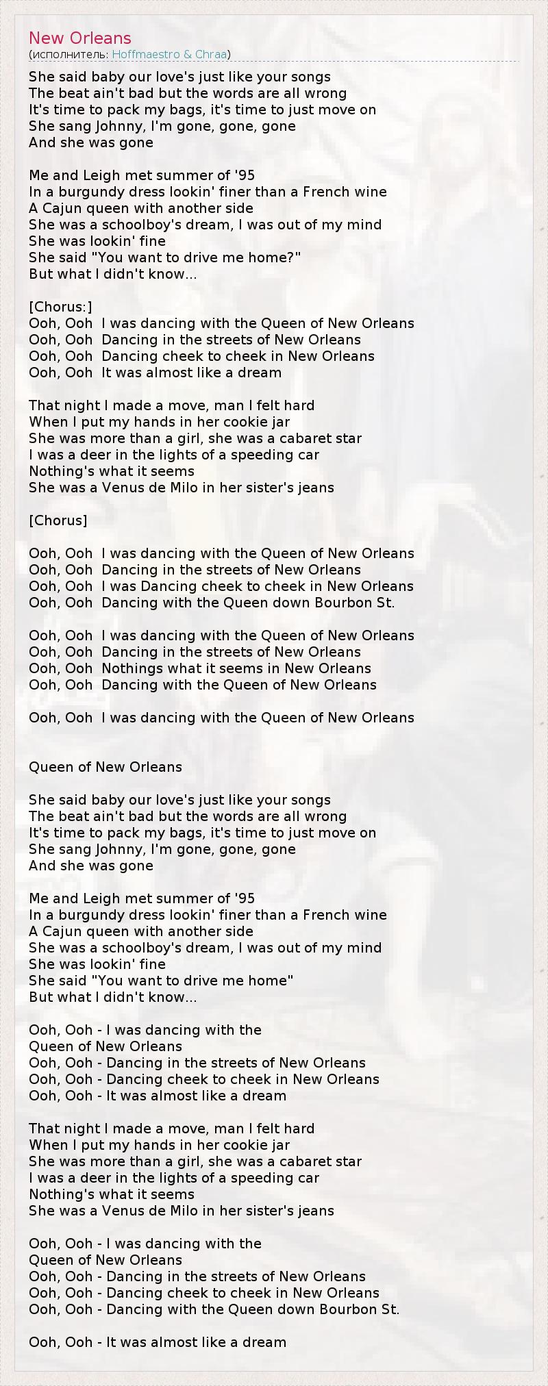 Она сказала мне: "Милый, наша любовь – как твои песни, Мотив неплохой, а вот слова никуда не годятся. Пора собирать чемоданы, пора двигаться дальше" И она пропела: "Джонни, я уезжаю, уезжаю..." И она уехала Мы с Лей познакомились летом 95-го. В платье цвета бургунди она была слаще французского вина, Королева Каджун, с другой стороны, Она была моей школьной мечтой, я сходил с ума. Она была прекрасна... Она спросила: "Не хочешь ли подвезти меня домой?" Но я не знал тогда... [Припев:] Оо, я танцевал с королевой Нового Орлеана, Оо, танцевал на улицах Нового Орлеана, Оо, танцевал щека к щеке в Новом Орлеане, Оо, это было словно во сне В ту ночь я решился, нелегко мне пришлось, Когда я руки запустил в ее вазу с печеньем. Она была не просто девушкой, а звездой кабаре, А я был словно олень в свете несущейся машины. Все не так, как кажется, Она была Венерой Милосской в джинсах своей сестры [Припев] Оо, я танцевал с королевой Нового Орлеана, Оо, танцевал на улицах Нового Орлеана, Оо, танцевал щека к щеке в Новом Орлеане, Оо, танцевал с королевой на Бурбон стрит Оо, я танцевал с королевой Нового Орлеана, Оо, танцевал на улицах Нового Орлеана, Оо, все не так, как кажется, в Новом Орлеане, Оо, танцевал с королевой Нового Орлеана Оо, я танцевал с королевой Нового Орлеана Королева Нового Орлеана (перевод Нагайна из Москвы) Она сказала "Детка, наша любовь, прямо как твои песни, – Бит неплох, но все слова неверны. Мне пора паковать чемоданы, пора просто двигаться дальше". Она напевала "Джонни, я ушла, ушла, ушла", И она ушла. Мы с Ли встретили лето 95го, Она была в бордовом платье, и выглядела лучше, чем французское вино. Она – Каджунская королева с другой окраины, Она была мечтой любого школьника, я был не в своем уме. Она выглядела великолепно, Она сказала: "Не хочешь отвезти меня домой?", Но кое-чего я не знал... У-у, я танцевал С королевой Нового Орлеана! У-у, танцевал на улицах Нового Орлеана. У-у, танцевал щека к щеке в Новом Орлеане. У-у, это было практически как во сне. Той ночью я сделал шаг, боже, это было тяжело, Когда я сунул свои руки в ее банку с печеньем. Она была больше, чем просто девчонка, она была звездой кабаре. Я чувствовал себя оленем в свете фар несущейся машины, Все не то, чем кажется, Она была Венерой Милосской в джинсах своей сестры. У-у, я танцевал С королевой Нового Орлеана! У-у, танцевал на улицах Нового Орлеана. У-у, танцевал щека к щеке в Новом Орлеане. У-у, танцевал с королевой на Бурбон-стрит. У-у, это было почти как во сне.