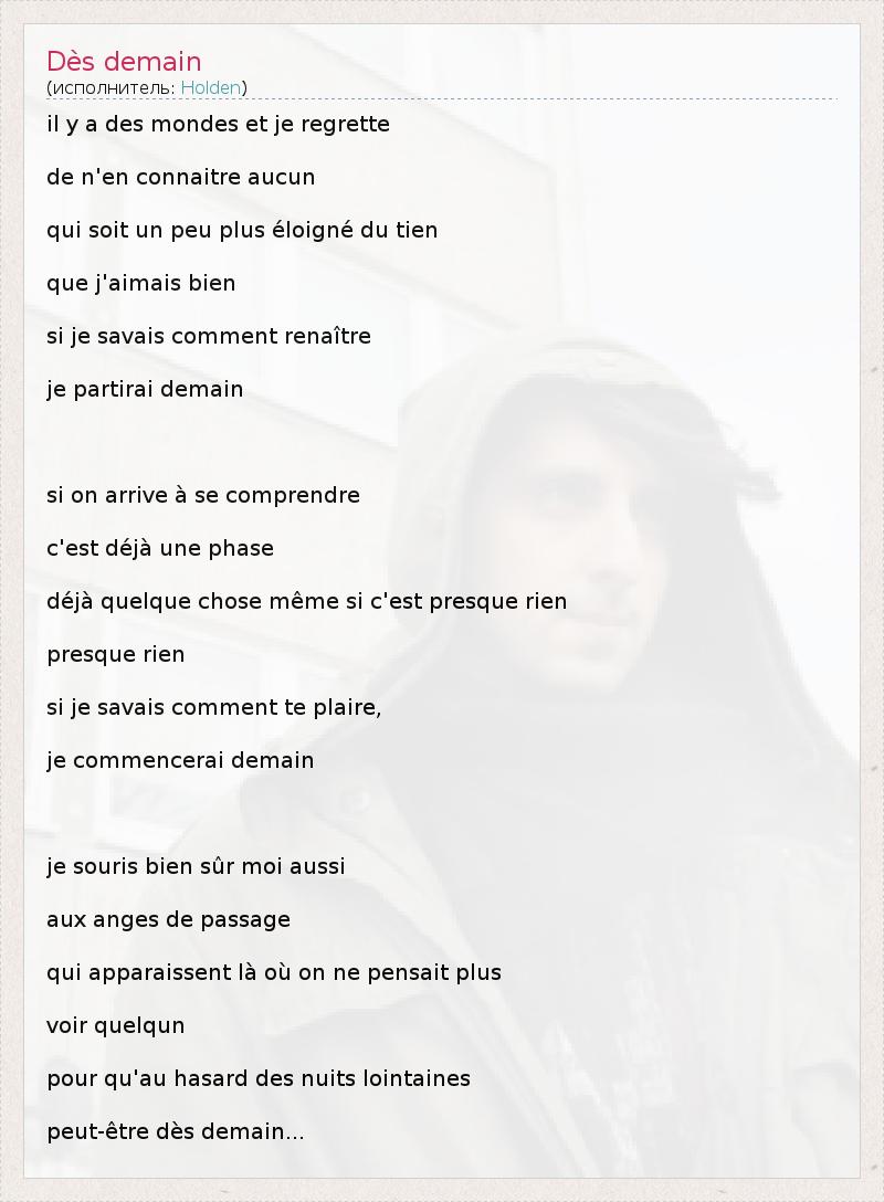 il y a des mondes et je regrette de n'en connaitre aucun qui soit un peu plus éloigné du tien que j'aimais bien si je savais comment renaître je partirai demain si on arrive à se comprendre c'est déjà une phase déjà quelque chose même si c'est presque rien presque rien si je savais comment te plaire, je commencerai demain je souris bien sûr moi aussi aux anges de passage qui apparaissent là où on ne pensait plus voir quelqun pour qu'au hasard des nuits lointaines peut-être dès demain...