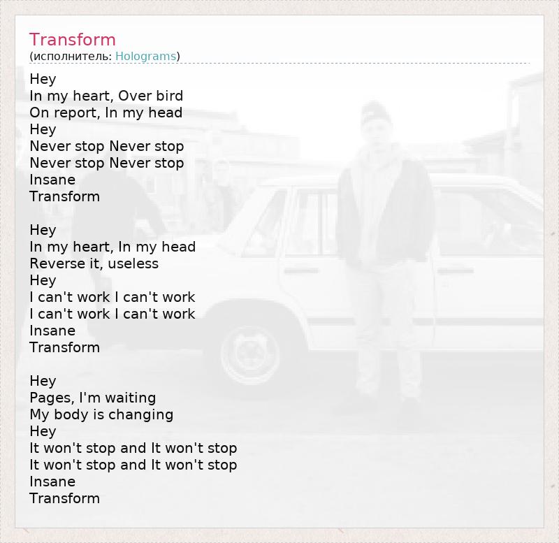 Hey In my heart, Over bird On report, In my head Hey Never stop Never stop Never stop Never stop Insane Transform Hey In my heart, In my head Reverse it, useless Hey I can't work I can't work I can't work I can't work Insane Transform Hey Pages, I'm waiting My body is changing Hey It won't stop and It won't stop It won't stop and It won't stop Insane Transform