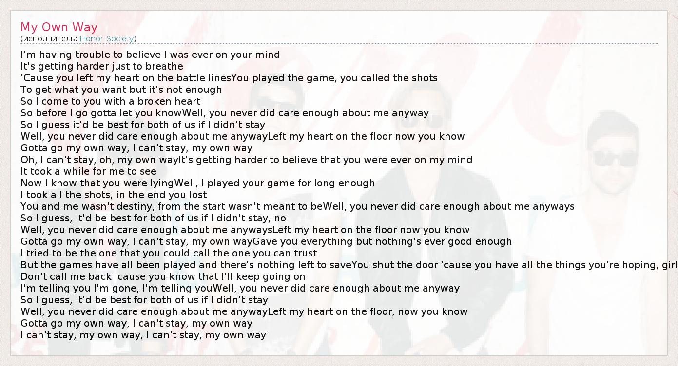 I'm having trouble to believe I was ever on your mind It's getting harder just to breathe 'Cause you left my heart on the battle linesYou played the game, you called the shots To get what you want but it's not enough So I come to you with a broken heart So before I go gotta let you knowWell, you never did care enough about me anyway So I guess it'd be best for both of us if I didn't stay Well, you never did care enough about me anywayLeft my heart on the floor now you know Gotta go my own way, I can't stay, my own way Oh, I can't stay, oh, my own wayIt's getting harder to believe that you were ever on my mind It took a while for me to see Now I know that you were lyingWell, I played your game for long enough I took all the shots, in the end you lost You and me wasn't destiny, from the start wasn't meant to beWell, you never did care enough about me anyways So I guess, it'd be best for both of us if I didn't stay, no Well, you never did care enough about me anywaysLeft my heart on the floor now you know Gotta go my own way, I can't stay, my own wayGave you everything but nothing's ever good enough I tried to be the one that you could call the one you can trust But the games have all been played and there's nothing left to saveYou shut the door 'cause you have all the things you're hoping, girl Don't call me back 'cause you know that I'll keep going on I'm telling you I'm gone, I'm telling youWell, you never did care enough about me anyway So I guess, it'd be best for both of us if I didn't stay Well, you never did care enough about me anywayLeft my heart on the floor, now you know Gotta go my own way, I can't stay, my own way I can't stay, my own way, I can't stay, my own way