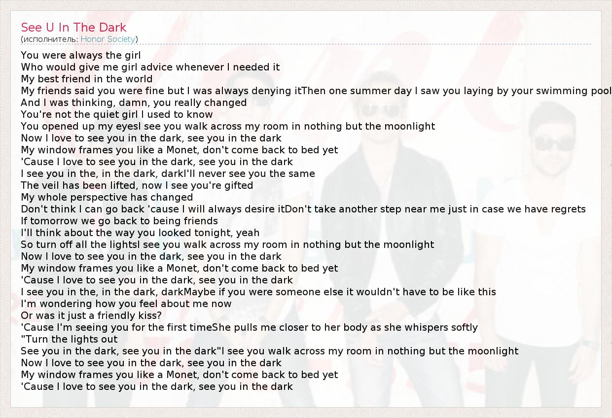 You were always the girl Who would give me girl advice whenever I needed it My best friend in the world My friends said you were fine but I was always denying itThen one summer day I saw you laying by your swimming pool And I was thinking, damn, you really changed You're not the quiet girl I used to know You opened up my eyesI see you walk across my room in nothing but the moonlight Now I love to see you in the dark, see you in the dark My window frames you like a Monet, don't come back to bed yet 'Cause I love to see you in the dark, see you in the dark I see you in the, in the dark, darkI'll never see you the same The veil has been lifted, now I see you're gifted My whole perspective has changed Don't think I can go back 'cause I will always desire itDon't take another step near me just in case we have regrets If tomorrow we go back to being friends I'll think about the way you looked tonight, yeah So turn off all the lightsI see you walk across my room in nothing but the moonlight Now I love to see you in the dark, see you in the dark My window frames you like a Monet, don't come back to bed yet 'Cause I love to see you in the dark, see you in the dark I see you in the, in the dark, darkMaybe if you were someone else it wouldn't have to be like this I'm wondering how you feel about me now Or was it just a friendly kiss? 'Cause I'm seeing you for the first timeShe pulls me closer to her body as she whispers softly "Turn the lights out See you in the dark, see you in the dark"I see you walk across my room in nothing but the moonlight Now I love to see you in the dark, see you in the dark My window frames you like a Monet, don't come back to bed yet 'Cause I love to see you in the dark, see you in the dark