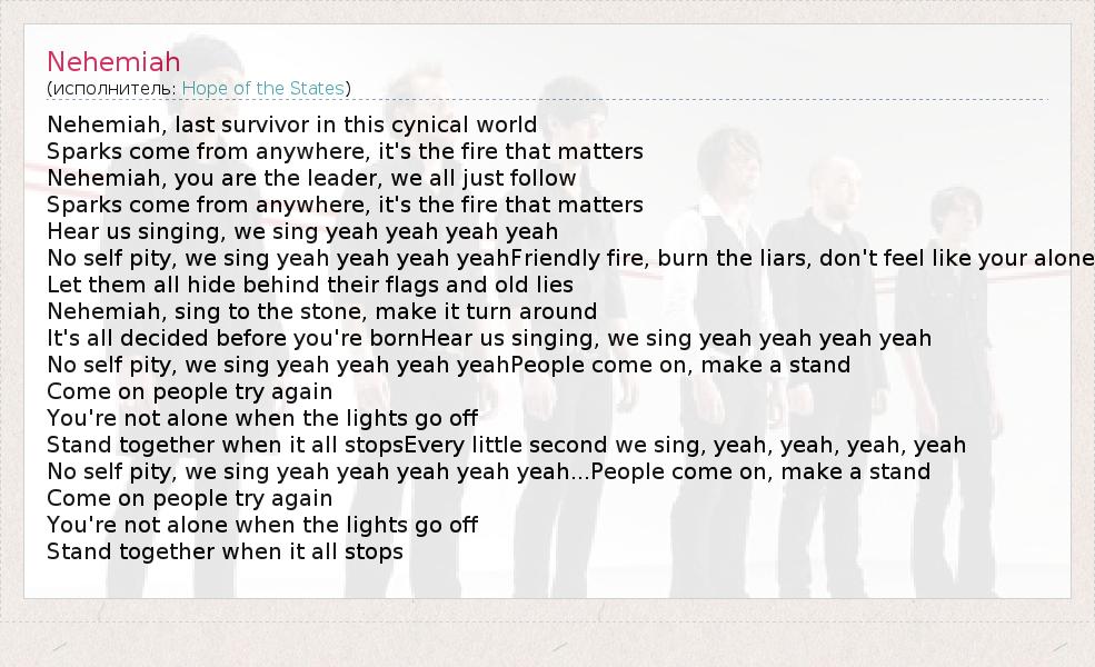 Nehemiah, last survivor in this cynical world Sparks come from anywhere, it's the fire that matters Nehemiah, you are the leader, we all just follow Sparks come from anywhere, it's the fire that matters Hear us singing, we sing yeah yeah yeah yeah No self pity, we sing yeah yeah yeah yeahFriendly fire, burn the liars, don't feel like your alone Let them all hide behind their flags and old lies Nehemiah, sing to the stone, make it turn around It's all decided before you're bornHear us singing, we sing yeah yeah yeah yeah No self pity, we sing yeah yeah yeah yeahPeople come on, make a stand Come on people try again You're not alone when the lights go off Stand together when it all stopsEvery little second we sing, yeah, yeah, yeah, yeah No self pity, we sing yeah yeah yeah yeah yeah...People come on, make a stand Come on people try again You're not alone when the lights go off Stand together when it all stops