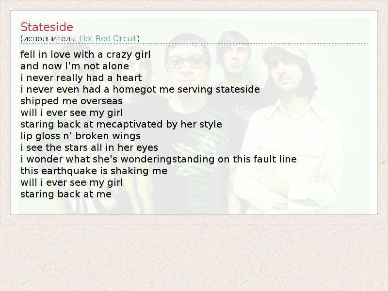 fell in love with a crazy girl and now I'm not alone i never really had a heart i never even had a homegot me serving stateside shipped me overseas will i ever see my girl staring back at mecaptivated by her style lip gloss n' broken wings i see the stars all in her eyes i wonder what she's wonderingstanding on this fault line this earthquake is shaking me will i ever see my girl staring back at me