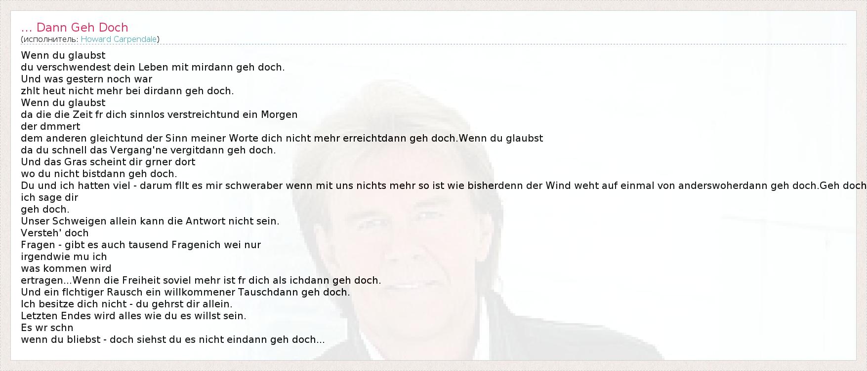 Wenn du glaubst du verschwendest dein Leben mit mirdann geh doch. Und was gestern noch war zhlt heut nicht mehr bei dirdann geh doch. Wenn du glaubst da die die Zeit fr dich sinnlos verstreichtund ein Morgen der dmmert dem anderen gleichtund der Sinn meiner Worte dich nicht mehr erreichtdann geh doch.Wenn du glaubst da du schnell das Vergang'ne vergitdann geh doch. Und das Gras scheint dir grner dort wo du nicht bistdann geh doch. Du und ich hatten viel - darum fllt es mir schweraber wenn mit uns nichts mehr so ist wie bisherdenn der Wind weht auf einmal von anderswoherdann geh doch.Geh doch ich sage dir geh doch. Unser Schweigen allein kann die Antwort nicht sein. Versteh' doch Fragen - gibt es auch tausend Fragenich wei nur irgendwie mu ich was kommen wird ertragen...Wenn die Freiheit soviel mehr ist fr dich als ichdann geh doch. Und ein flchtiger Rausch ein willkommener Tauschdann geh doch. Ich besitze dich nicht - du gehrst dir allein. Letzten Endes wird alles wie du es willst sein. Es wr schn wenn du bliebst - doch siehst du es nicht eindann geh doch...