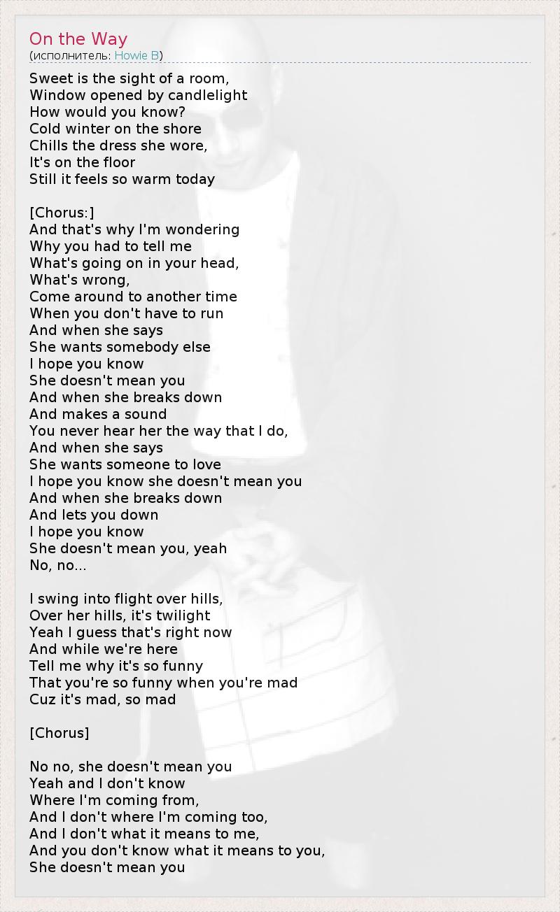 Комната, как конфетка, В окне свет свечи, Откуда тебе знать? Холодная зима на берегу Охлаждает платье, что на ней было, Оно сейчас на полу, Но все же, кажется, сегодня так тепло [Припев:] И вот почему я задаюсь вопросом, Почему тебе нужно было мне сказать, Что происходит у тебя в голове, И что не так, Приходи попозже, Когда тебе не нужно будет бежать, И когда она говорит, Что хочет еще кого-то, Я надеюсь, что ты знаешь, Она не имеет в виду тебя, И когда теряет самообладание И кричит, Ты никогда не услышишь ее, как я, И когда она говорит, Что хочет любить кого-то, Я надеюсь, ты знаешь, это не про тебя, И когда она надломлена И подводит тебя, Я надеюсь ты знаешь, Она не имеет в виду тебя, да Нет, нет... Я парю над холмами, Над ее холмами, наступают сумерки, Да, я думаю, всё правильно сейчас, Пока мы здесь, Скажи мне, почему это так смешно, Почему ты смешон, ведь ты сумасшедший, Потому что это глупо, так глупо [Припев] Нет, нет, она не имеет в виду тебя, Да, и я не знаю, От чего я ухожу И куда иду, И я не знаю, что это значит для меня, А ты не знаешь, что это значит для тебя, Она не имеет в виду тебя