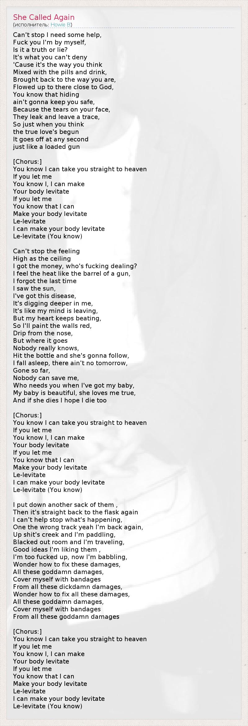 Не могу остановиться, мне нужна помощь, Отвалите все, я сам по себе, Это правда или ложь? Это нельзя отрицать, Ведь это твои мысли, Перемешанные с таблетками и спиртным. Тебя вернули к твоему истинному я, Ты там, высоко, уже близко к Богу, И ты знаешь, что спрятавшись, не спасешься, Потому что слезы текут по лицу И оставляют следы, И как раз когда ты думаешь, Что вот настоящая любовь, Она выстреливает в любую секунду, Как заряженный пистолет. [Припев:] Знаешь, я могу отвести тебя прямо в рай, Если ты мне позволишь, Знаешь, я, я могу Заставить твое тело левитировать, Если ты мне позволишь, Знаешь, я могу Заставить твое тело левитировать, Ле-левитировать, я могу заставить твое тело левитировать, Ле-левитировать (знаешь) Не могу остановить чувство Парения под потолком, У меня куча денег, кто тут дилер, бл*? Я чувствую жар, как дуло пушки, Я забыл, когда в последний раз Видел солнце, Меня захватила эта болезнь, Она проникает все глубже, Кажется, сознание покидает меня, Но сердце продолжает биться. И я выкрашу стены в красный, Разобью нос до крови, Но куда все это ведет, Никто реально не знает, И я уйду в запой, она пойдет со мной, Я засыпаю, и завтрашнего дня не существует, Я зашел так далеко, Что никому меня не спасти, Кому нужен ты, у меня есть моя детка, Моя детка прекрасна, искренне меня любит, И если она умрет, то я, надеюсь, умру тоже. [Припев:] Знаешь, я могу отвести тебя прямо в рай, Если ты мне позволишь, Знаешь, я, я могу Заставить твое тело левитировать, Если ты мне позволишь, Знаешь, я могу Заставить твое тело левитировать, Ле-левитировать, я могу заставить твое тело левитировать, Ле-левитировать (знаешь) Проглатываю еще пачку таблеток, Потом опять же прикладываюсь к бутылке, Я не могу остановить то, что происходит, Да, я опять иду по ложному пути, Я гребу в луже полного дер*ма, В комнате темно, и я уплываю куда-то, Хорошие идеи, мне они нравятся, Я слишком нажрался и несу полный бред, Не знаю, как залечить эти повреждения, Все эти чертовы повреждения, Перевязываю себя бинтами От этих чертовых повреждений, Не знаю, как залечить эти повреждения, Все эти чертовы повреждения, Перевязываю себя бинтами От этих чертовых повреждений. [Припев:] Знаешь, я могу отвести тебя прямо в рай, Если ты мне позволишь, Знаешь, я, я могу Заставить твое тело левитировать, Если ты мне позволишь, Знаешь, я могу Заставить твое тело левитировать, Ле-левитировать, я могу заставить твое тело левитировать, Ле-левитировать (знаешь)