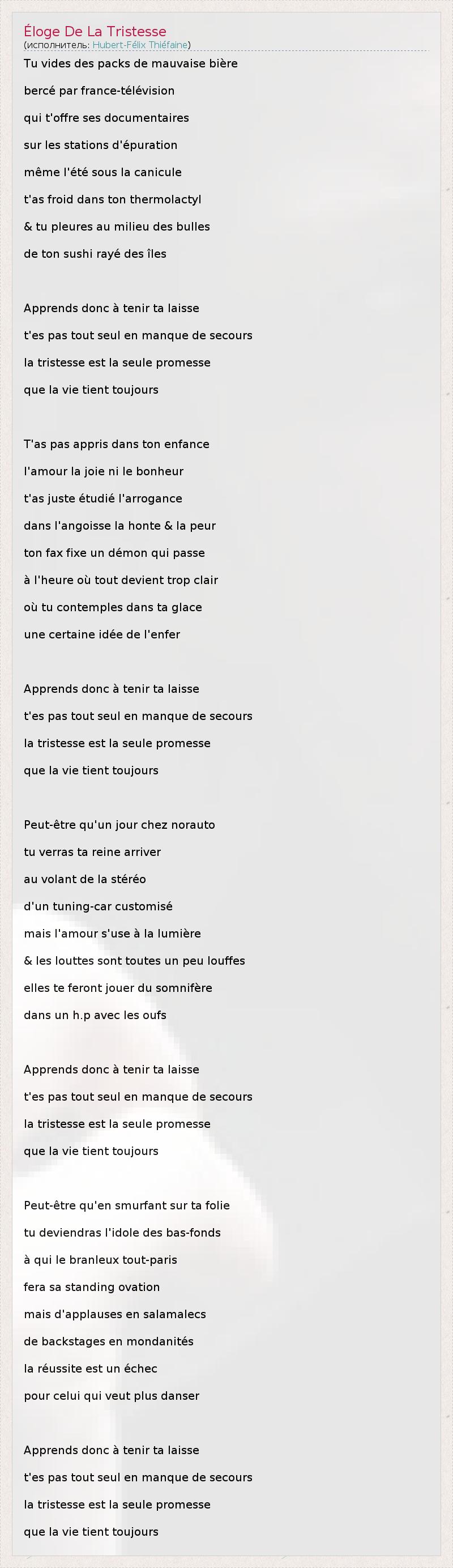 А как ты думаешь, о чем песня "Éloge De La Tristesse" ?