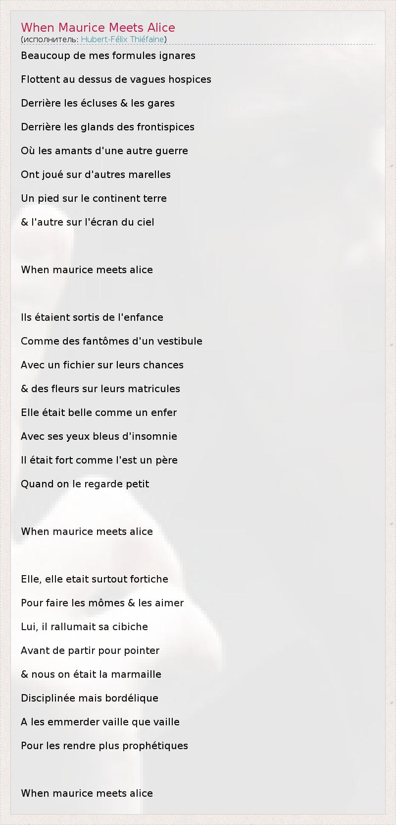 А как ты думаешь, о чем песня "When Maurice Meets Alice" ?