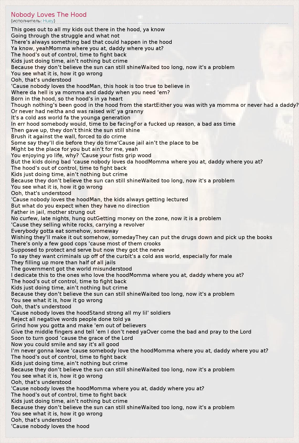 This goes out to all my kids out there in the hood, ya know Going through the struggle and what not There's always something bad that could happen in the hood Ya know, yeahMomma where you at, daddy where you at? The hood's out of control, time to fight back Kids just doing time, ain't nothing but crime Because they don't believe the sun can still shineWaited too long, now it's a problem You see what it is, how it go wrong Ooh, that's understood 'Cause nobody loves the hoodMan, this hook is too true to believe in Where da hell is ya momma and daddy when you need 'em? Born in the hood, so the hood's in ya heart Though nothing's been good in the hood from the startEither you was with ya momma or never had a daddy? Or never had neitha and was raised wit' ya granny It's a cold ass world fa the younga generation In err hood somebody would, time to be facingFor a fucked up reason, a bad ass time Then gave up, they don't think the sun still shine Brush it against the wall, forced to do crime Some say they'll die before they do time'Cause jail ain't the place to be Might be the place for you but ain't for me, yeah You enjoying yo life, why? 'Cause your fists grip wood But the kids doing bad 'cause nobody loves da hoodMomma where you at, daddy where you at? The hood's out of control, time to fight back Kids just doing time, ain't nothing but crime Because they don't believe the sun can still shineWaited too long, now it's a problem You see what it is, how it go wrong Ooh, that's understood 'Cause nobody loves the hoodMan, the kids always getting lectured But what do you expect when they have no direction Father in jail, mother strung out No curfew, late nights, hung outGetting money on the zone, now it is a problem 'Cause they selling white rocks, carrying a revolver Everybody gotta eat somehow, someway Wishing they'll make it out somehow, somedayThey can put the drugs down and pick up the books There's only a few good cops 'cause most of them crooks Supposed to protect and serve but now they got the nerve To say they want criminals up off of the curbIt's a cold ass world, especially for male They filling up more than half of all jails The government got the world misunderstood I dedicate this to the ones who love the hoodMomma where you at, daddy where you at? The hood's out of control, time to fight back Kids just doing time, ain't nothing but crime Because they don't believe the sun can still shineWaited too long, now it's a problem You see what it is, how it go wrong Ooh, that's understood 'Cause nobody loves the hoodStand strong all my lil' soldiers Reject all negative words people done told ya Grind how you gotta and make 'em out of believers Give the middle fingers and tell 'em I don't need yaOver come the bad and pray to the Lord Soon to turn good 'cause the grace of the Lord Now you could smile and say it's all good I'm never gonna leave 'cause somebody love the hoodMomma where you at, daddy where you at? The hood's out of control, time to fight back Kids just doing time, ain't nothing but crime Because they don't believe the sun can still shineWaited too long, now it's a problem You see what it is, how it go wrong Ooh, that's understood 'Cause nobody loves the hoodMomma where you at, daddy where you at? The hood's out of control, time to fight back Kids just doing time, ain't nothing but crime Because they don't believe the sun can still shineWaited too long, now it's a problem You see what it is, how it go wrong Ooh, that's understood 'Cause nobody loves the hood