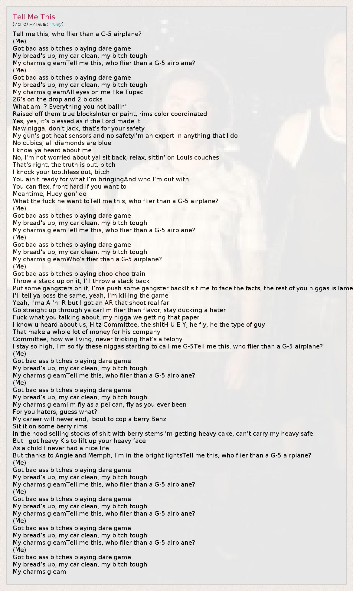 Tell me this, who flier than a G-5 airplane? (Me) Got bad ass bitches playing dare game My bread's up, my car clean, my bitch tough My charms gleamTell me this, who flier than a G-5 airplane? (Me) Got bad ass bitches playing dare game My bread's up, my car clean, my bitch tough My charms gleamAll eyes on me like Tupac 26's on the drop and 2 blocks What am I? Everything you not ballin' Raised off them true blocksInterior paint, rims color coordinated Yes, yes, it's blessed as if the Lord made it Naw nigga, don't jack, that's for your safety My gun's got heat sensors and no safetyI'm an expert in anything that I do No cubics, all diamonds are blue I know ya heard about me No, I'm not worried about yaI sit back, relax, sittin' on Louis couches That's right, the truth is out, bitch I knock your toothless out, bitch You ain't ready for what I'm bringingAnd who I'm out with You can flex, front hard if you want to Meantime, Huey gon' do What the fuck he want toTell me this, who flier than a G-5 airplane? (Me) Got bad ass bitches playing dare game My bread's up, my car clean, my bitch tough My charms gleamTell me this, who flier than a G-5 airplane? (Me) Got bad ass bitches playing dare game My bread's up, my car clean, my bitch tough My charms gleamWho's flier than a G-5 airplane? (Me) Got bad ass bitches playing choo-choo train Throw a stack up on it, I'll throw a stack back Put some gangsters on it, I'ma push some gangster backIt's time to face the facts, the rest of you niggas is lame I'll tell ya boss the same, yeah, I'm killing the game Yeah, I'ma A 'n' R but I got an AR that shoot real far Go straight up through ya carI'm flier than flavor, stay ducking a hater Fuck what you talking about, my nigga we getting that paper I know u heard about us, Hitz Committee, the shitH U E Y, he fly, he the type of guy That make a whole lot of money for his company Committee, how we living, never tricking that's a felony I stay so high, I'm so fly these niggas starting to call me G-5Tell me this, who flier than a G-5 airplane? (Me) Got bad ass bitches playing dare game My bread's up, my car clean, my bitch tough My charms gleamTell me this, who flier than a G-5 airplane? (Me) Got bad ass bitches playing dare game My bread's up, my car clean, my bitch tough My charms gleamI'm fly as a pelican, fly as you ever been For you haters, guess what? My career will never end, 'bout to cop a berry Benz Sit it on some berry rims In the hood selling stocks of shit with berry stemsI'm getting heavy cake, can't carry my heavy safe But I got heavy K's to lift up your heavy face As a child I never had a nice life But thanks to Angie and Memph, I'm in the bright lightsTell me this, who flier than a G-5 airplane? (Me) Got bad ass bitches playing dare game My bread's up, my car clean, my bitch tough My charms gleamTell me this, who flier than a G-5 airplane? (Me) Got bad ass bitches playing dare game My bread's up, my car clean, my bitch tough My charms gleamTell me this, who flier than a G-5 airplane? (Me) Got bad ass bitches playing dare game My bread's up, my car clean, my bitch tough My charms gleamTell me this, who flier than a G-5 airplane? (Me) Got bad ass bitches playing dare game My bread's up, my car clean, my bitch tough My charms gleam
