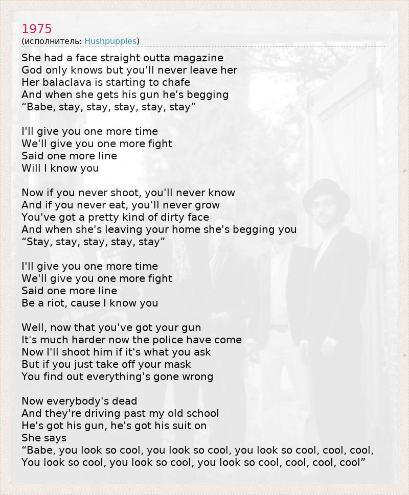 She had a face straight outta magazine God only knows but you'll never leave her Her balaclava is starting to chafe And when she gets his gun he's begging “Babe, stay, stay, stay, stay, stay” I'll give you one more time We'll give you one more fight Said one more line Will I know you Now if you never shoot, you'll never know And if you never eat, you'll never grow You've got a pretty kind of dirty face And when she's leaving your home she's begging you “Stay, stay, stay, stay, stay” I'll give you one more time We'll give you one more fight Said one more line Be a riot, cause I know you Well, now that you've got your gun It's much harder now the police have come Now I'll shoot him if it's what you ask But if you just take off your mask You find out everything's gone wrong Now everybody's dead And they're driving past my old school He's got his gun, he's got his suit on She says “Babe, you look so cool, you look so cool, you look so cool, cool, cool, You look so cool, you look so cool, you look so cool, cool, cool, cool”