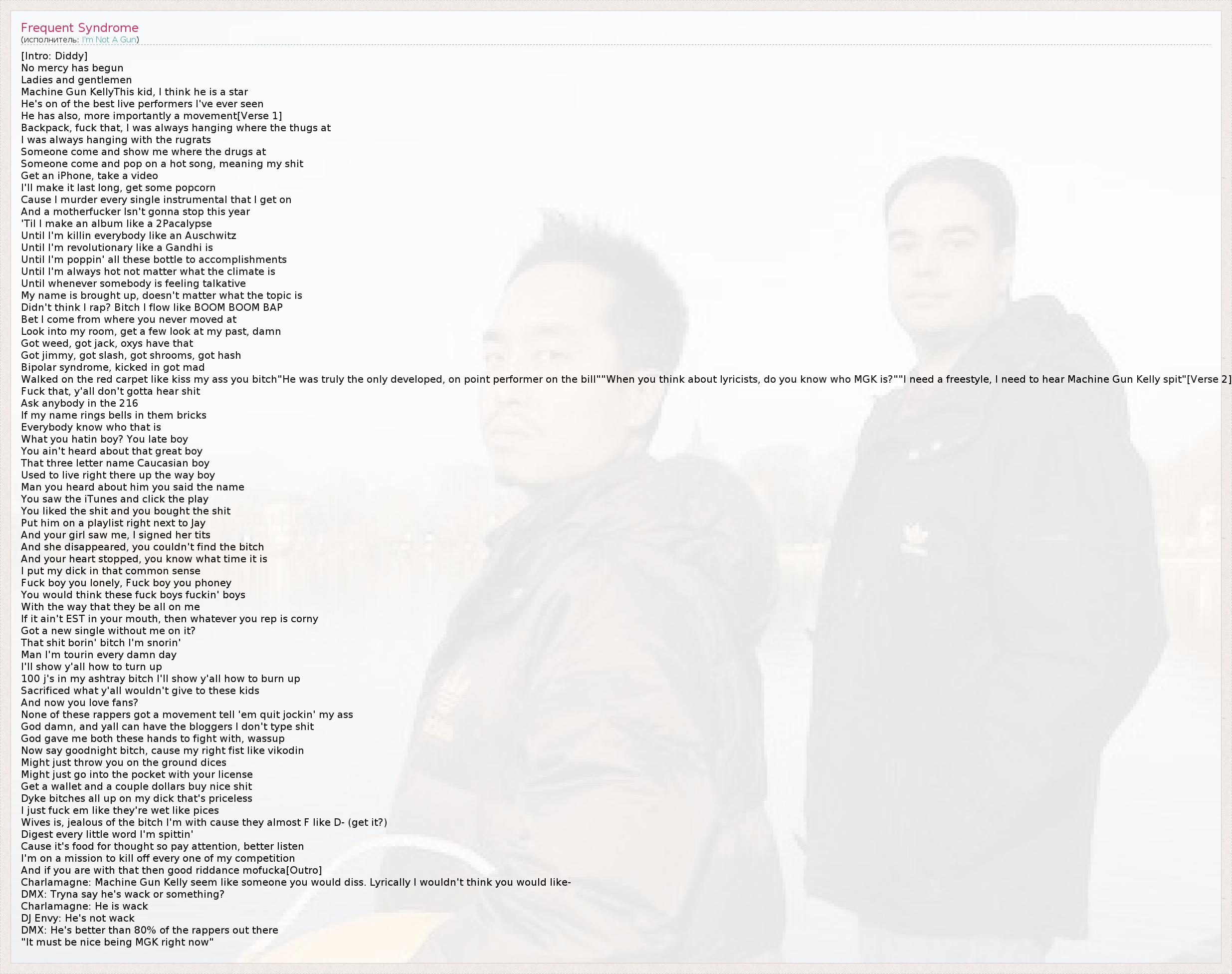 [Intro: Diddy] No mercy has begun Ladies and gentlemen Machine Gun KellyThis kid, I think he is a star He's on of the best live performers I've ever seen He has also, more importantly a movement[Verse 1] Backpack, fuck that, I was always hanging where the thugs at I was always hanging with the rugrats Someone come and show me where the drugs at Someone come and pop on a hot song, meaning my shit Get an iPhone, take a video I'll make it last long, get some popcorn Cause I murder every single instrumental that I get on And a motherfucker Isn't gonna stop this year 'Til I make an album like a 2Pacalypse Until I'm killin everybody like an Auschwitz Until I'm revolutionary like a Gandhi is Until I'm poppin' all these bottle to accomplishments Until I'm always hot not matter what the climate is Until whenever somebody is feeling talkative My name is brought up, doesn't matter what the topic is Didn't think I rap? Bitch I flow like BOOM BOOM BAP Bet I come from where you never moved at Look into my room, get a few look at my past, damn Got weed, got jack, oxys have that Got jimmy, got slash, got shrooms, got hash Bipolar syndrome, kicked in got mad Walked on the red carpet like kiss my ass you bitch"He was truly the only developed, on point performer on the bill""When you think about lyricists, do you know who MGK is?""I need a freestyle, I need to hear Machine Gun Kelly spit"[Verse 2] Fuck that, y'all don't gotta hear shit Ask anybody in the 216 If my name rings bells in them bricks Everybody know who that is What you hatin boy? You late boy You ain't heard about that great boy That three letter name Caucasian boy Used to live right there up the way boy Man you heard about him you said the name You saw the iTunes and click the play You liked the shit and you bought the shit Put him on a playlist right next to Jay And your girl saw me, I signed her tits And she disappeared, you couldn't find the bitch And your heart stopped, you know what time it is I put my dick in that common sense Fuck boy you lonely, Fuck boy you phoney You would think these fuck boys fuckin' boys With the way that they be all on me If it ain't EST in your mouth, then whatever you rep is corny Got a new single without me on it? That shit borin' bitch I'm snorin' Man I'm tourin every damn day I'll show y'all how to turn up 100 j's in my ashtray bitch I'll show y'all how to burn up Sacrificed what y'all wouldn't give to these kids And now you love fans? None of these rappers got a movement tell 'em quit jockin' my ass God damn, and yall can have the bloggers I don't type shit God gave me both these hands to fight with, wassup Now say goodnight bitch, cause my right fist like vikodin Might just throw you on the ground dices Might just go into the pocket with your license Get a wallet and a couple dollars buy nice shit Dyke bitches all up on my dick that's priceless I just fuck em like they're wet like pices Wives is, jealous of the bitch I'm with cause they almost F like D- (get it?) Digest every little word I'm spittin' Cause it's food for thought so pay attention, better listen I'm on a mission to kill off every one of my competition And if you are with that then good riddance mofucka[Outro] Charlamagne: Machine Gun Kelly seem like someone you would diss. Lyrically I wouldn't think you would like- DMX: Tryna say he's wack or something? Charlamagne: He is wack DJ Envy: He's not wack DMX: He's better than 80% of the rappers out there "It must be nice being MGK right now"