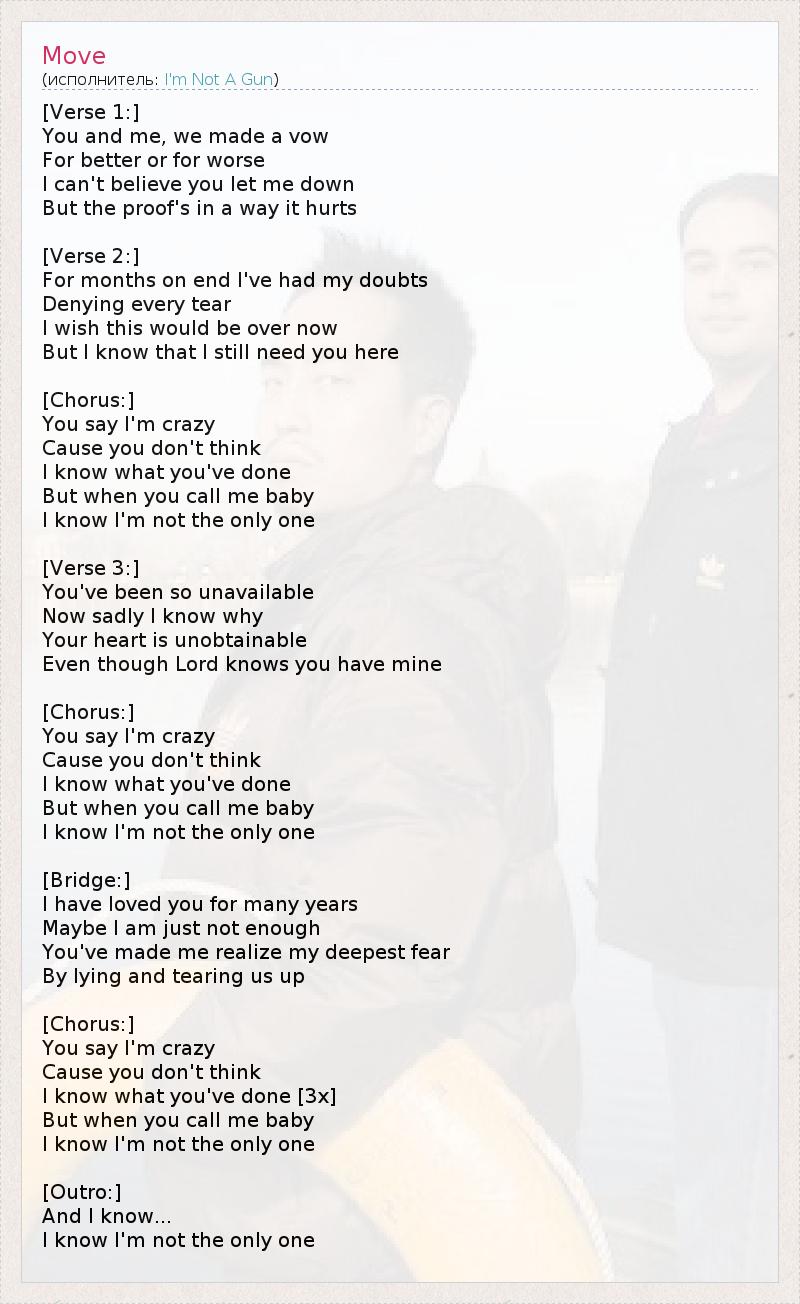 [1 куплет:] Мы поклялись друг другу в верности, Что бы ни случилось. Не могу поверить, что ты подвела меня. Но доказательства таковы, что мне больно. [2 куплет:] Несколько месяцев я сомневался, Не позволяя себе плакать. Я так хочу, чтобы это закончилось, Но я знаю, что ты всё ещё нужна мне. [Припев:] Ты говоришь, что я сумасшедший, Потому что ты думаешь, Что я не знаю, что ты сделала. Но когда ты зовешь меня "малыш", Я знаю, что я у тебя не единственный. [3 куплет:] Ты была такой отстраненной. Теперь я с горечью понимаю, почему. Твое сердце недоступно, Но ведь Бог знает, что моё – у тебя. [Припев:] Ты говоришь, что я сумасшедший, Потому что ты думаешь, Что я не знаю, что ты сделала. Но когда ты зовешь меня "малыш", Я знаю, что я у тебя не единственный. [Переход:] Я любил тебя столько лет. Может быть, тебе меня мало? Из-за того, что ты лгала и разлучила нас, Мой самый глубокий страх стал реальностью. [Припев:] Ты говоришь, что я сумасшедший, Потому что ты думаешь, Что я не знаю, что ты сделала. [3x] Но когда ты зовешь меня "малыш", Я знаю, что я у тебя не единственный. [Окончание:] И я знаю... Я знаю, что я у тебя не единственный.