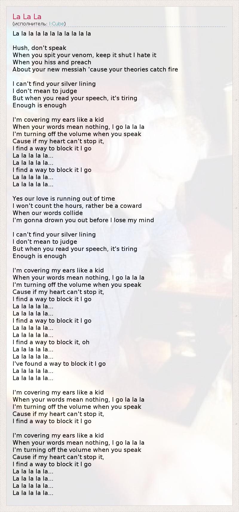 La la la la la la la la la la la Hush, don't speak When you spit your venom, keep it shut I hate it When you hiss and preach About your new messiah 'cause your theories catch fire I can't find your silver lining I don't mean to judge But when you read your speech, it's tiring Enough is enough I'm covering my ears like a kid When your words mean nothing, I go la la la I'm turning off the volume when you speak Cause if my heart can't stop it, I find a way to block it I go La la la la la... La la la la la... I find a way to block it I go La la la la la... La la la la la... Yes our love is running out of time I won't count the hours, rather be a coward When our words collide I'm gonna drown you out before I lose my mind I can't find your silver lining I don't mean to judge But when you read your speech, it's tiring Enough is enough I'm covering my ears like a kid When your words mean nothing, I go la la la I'm turning off the volume when you speak Cause if my heart can't stop it, I find a way to block it I go La la la la la... La la la la la... I find a way to block it I go La la la la la... La la la la la... I find a way to block it, oh La la la la la... La la la la la... I've found a way to block it I go La la la la la... La la la la la... I'm covering my ears like a kid When your words mean nothing, I go la la la I'm turning off the volume when you speak Cause if my heart can't stop it, I find a way to block it I go I'm covering my ears like a kid When your words mean nothing, I go la la la I'm turning off the volume when you speak Cause if my heart can't stop it, I find a way to block it I go La la la la la... La la la la la... La la la la la... La la la la la...