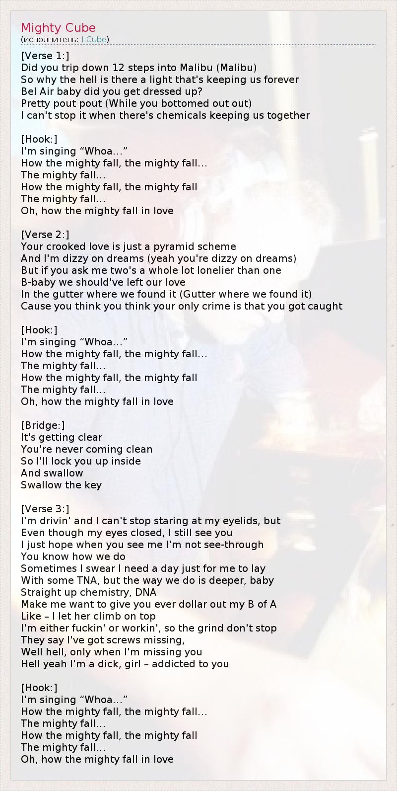 [Verse 1:] Did you trip down 12 steps into Malibu (Malibu) So why the hell is there a light that's keeping us forever Bel Air baby did you get dressed up? Pretty pout pout (While you bottomed out out) I can't stop it when there's chemicals keeping us together [Hook:] I'm singing “Whoa…” How the mighty fall, the mighty fall… The mighty fall… How the mighty fall, the mighty fall The mighty fall… Oh, how the mighty fall in love [Verse 2:] Your crooked love is just a pyramid scheme And I'm dizzy on dreams (yeah you're dizzy on dreams) But if you ask me two's a whole lot lonelier than one B-baby we should've left our love In the gutter where we found it (Gutter where we found it) Cause you think you think your only crime is that you got caught [Hook:] I'm singing “Whoa…” How the mighty fall, the mighty fall… The mighty fall… How the mighty fall, the mighty fall The mighty fall… Oh, how the mighty fall in love [Bridge:] It's getting clear You're never coming clean So I'll lock you up inside And swallow Swallow the key [Verse 3:] I'm drivin' and I can't stop staring at my eyelids, but Even though my eyes closed, I still see you I just hope when you see me I'm not see-through You know how we do Sometimes I swear I need a day just for me to lay With some TNA, but the way we do is deeper, baby Straight up chemistry, DNA Make me want to give you ever dollar out my B of A Like – I let her climb on top I'm either fuckin' or workin', so the grind don't stop They say I've got screws missing, Well hell, only when I'm missing you Hell yeah I'm a dick, girl – addicted to you [Hook:] I'm singing “Whoa…” How the mighty fall, the mighty fall… The mighty fall… How the mighty fall, the mighty fall The mighty fall… Oh, how the mighty fall in love