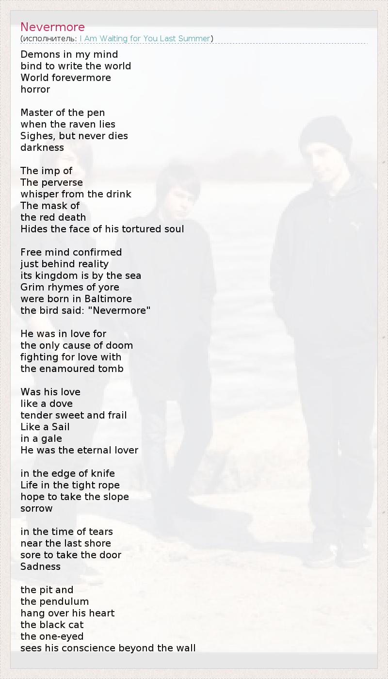 * – Песня посвящена поэту и писателю Эдгару Аллану По, текст наполнен аллюзиями на его произведения.