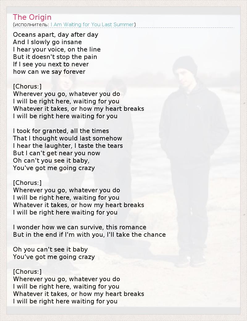 День за днём нас разделяют океаны, И я постепенно схожу с ума. Я слышу твой голос в телефонной трубке, Но это не останавливает боль: Если я почти никогда с тобой не вижусь, Как мы можем говорить "навечно"? [Припев:] Куда бы ты ни пошла, что бы ты ни сделала, Я буду здесь - ждать тебя... Сколько бы времени ни прошло, как бы больно ни было моему сердцу, Я буду здесь - ждать тебя... Я принимал как должное то время, что мы были вместе, И думал, что так будет всегда. Я слышу смех, ощущаю солноватый привкус слёз, Но сейчас тебя нет рядом... О, ты не видишь, малышка, Ты заставляешь меня сходить с ума... [Припев:] Куда бы ты ни пошла, что бы ты ни сделала, Я буду здесь - ждать тебя... Сколько бы времени ни прошло, как бы больно ни было моему сердцу, Я буду здесь - ждать тебя... Интересно, сможем ли мы пережить этот роман? Но в конце, если я останусь с тобой, я воспользуюсь шансом... О, ты не видишь, малышка, Ты заставляешь меня сходить с ума... [Припев:] Куда бы ты ни пошла, что бы ты ни сделала, Я буду здесь - ждать тебя... Сколько бы времени ни прошло, как бы больно ни было моему сердцу, Я буду здесь - ждать тебя...