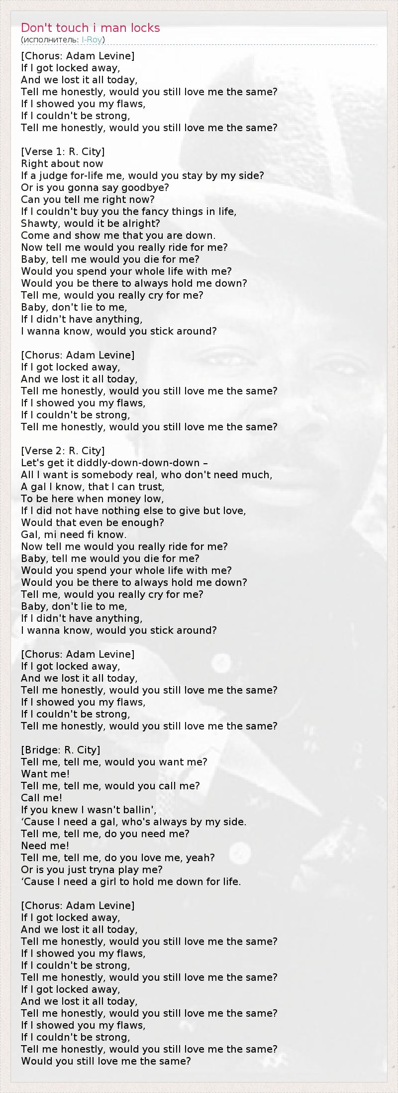 [Chorus: Adam Levine] If I got locked away, And we lost it all today, Tell me honestly, would you still love me the same? If I showed you my flaws, If I couldn't be strong, Tell me honestly, would you still love me the same? [Verse 1: R. City] Right about now If a judge for-life me, would you stay by my side? Or is you gonna say goodbye? Can you tell me right now? If I couldn't buy you the fancy things in life, Shawty, would it be alright? Come and show me that you are down. Now tell me would you really ride for me? Baby, tell me would you die for me? Would you spend your whole life with me? Would you be there to always hold me down? Tell me, would you really cry for me? Baby, don't lie to me, If I didn't have anything, I wanna know, would you stick around? [Chorus: Adam Levine] If I got locked away, And we lost it all today, Tell me honestly, would you still love me the same? If I showed you my flaws, If I couldn't be strong, Tell me honestly, would you still love me the same? [Verse 2: R. City] Let's get it diddly-down-down-down – All I want is somebody real, who don't need much, A gal I know, that I can trust, To be here when money low, If I did not have nothing else to give but love, Would that even be enough? Gal, mi need fi know. Now tell me would you really ride for me? Baby, tell me would you die for me? Would you spend your whole life with me? Would you be there to always hold me down? Tell me, would you really cry for me? Baby, don't lie to me, If I didn't have anything, I wanna know, would you stick around? [Chorus: Adam Levine] If I got locked away, And we lost it all today, Tell me honestly, would you still love me the same? If I showed you my flaws, If I couldn't be strong, Tell me honestly, would you still love me the same? [Bridge: R. City] Tell me, tell me, would you want me? Want me! Tell me, tell me, would you call me? Call me! If you knew I wasn't ballin', ‘Cause I need a gal, who's always by my side. Tell me, tell me, do you need me? Need me! Tell me, tell me, do you love me, yeah? Or is you just tryna play me? ‘Cause I need a girl to hold me down for life. [Chorus: Adam Levine] If I got locked away, And we lost it all today, Tell me honestly, would you still love me the same? If I showed you my flaws, If I couldn't be strong, Tell me honestly, would you still love me the same? If I got locked away, And we lost it all today, Tell me honestly, would you still love me the same? If I showed you my flaws, If I couldn't be strong, Tell me honestly, would you still love me the same? Would you still love me the same?