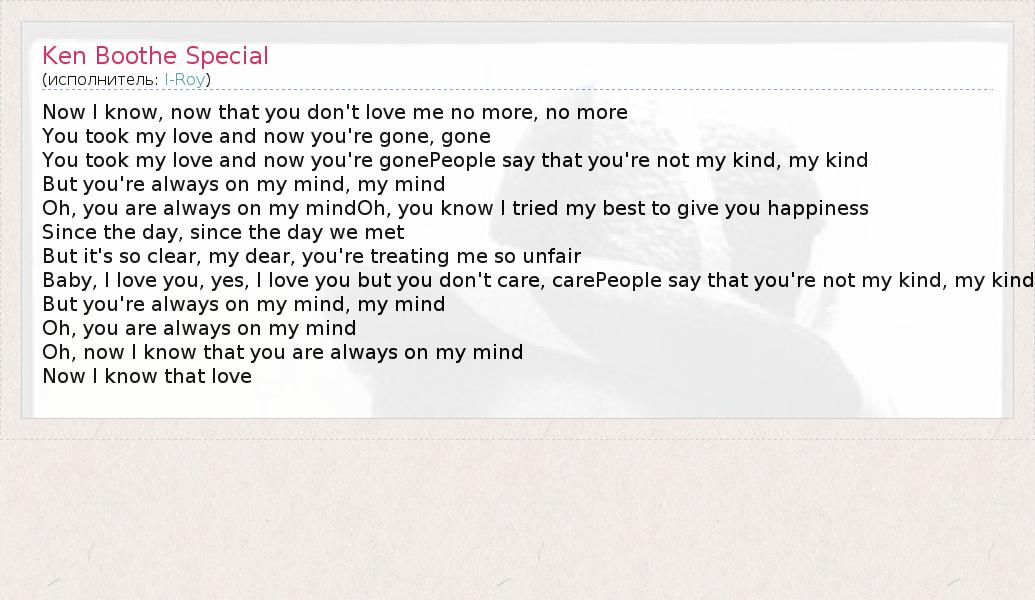 А как ты думаешь, о чем песня "Ken Boothe Special" ?