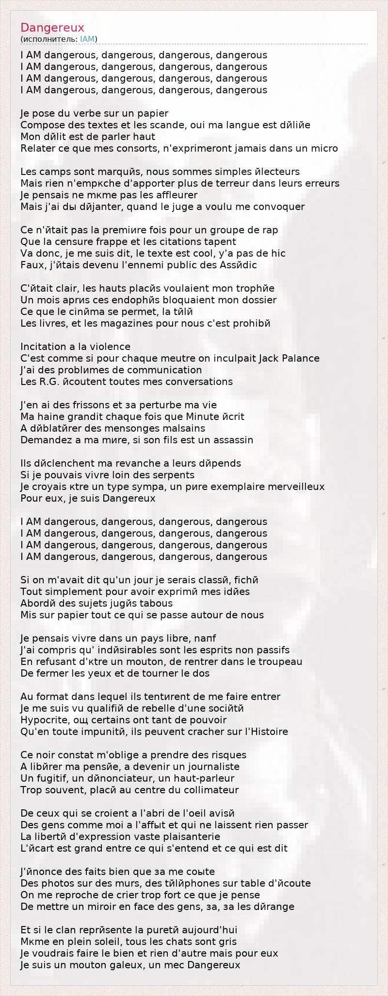 I AM dangerous, dangerous, dangerous, dangerous I AM dangerous, dangerous, dangerous, dangerous I AM dangerous, dangerous, dangerous, dangerous I AM dangerous, dangerous, dangerous, dangerous Je pose du verbe sur un papier Compose des textes et les scande, oui ma langue est dйliйe Mon dйlit est de parler haut Relater ce que mes consorts, n'exprimeront jamais dans un micro Les camps sont marquйs, nous sommes simples йlecteurs Mais rien n'empкche d'apporter plus de terreur dans leurs erreurs Je pensais ne mкme pas les affleurer Mais j'ai dы dйjanter, quand le juge a voulu me convoquer Ce n'йtait pas la premiиre fois pour un groupe de rap Que la censure frappe et les citations tapent Va donc, je me suis dit, le texte est cool, y'a pas de hic Faux, j'йtais devenu l'ennemi public des Assйdic C'йtait clair, les hauts placйs voulaient mon trophйe Un mois aprиs ces endophйs bloquaient mon dossier Ce que le cinйma se permet, la tйlй Les livres, et les magazines pour nous c'est prohibй Incitation а la violence C'est comme si pour chaque meutre on inculpait Jack Palance J'ai des problиmes de communication Les R.G. йcoutent toutes mes conversations J'en ai des frissons et зa perturbe ma vie Ma haine grandit chaque fois que Minute йcrit A dйblatйrer des mensonges malsains Demandez а ma mиre, si son fils est un assassin Ils dйclenchent ma revanche а leurs dйpends Si je pouvais vivre loin des serpents Je croyais кtre un type sympa, un pиre exemplaire merveilleux Pour eux, je suis Dangereux I AM dangerous, dangerous, dangerous, dangerous I AM dangerous, dangerous, dangerous, dangerous I AM dangerous, dangerous, dangerous, dangerous I AM dangerous, dangerous, dangerous, dangerous Si on m'avait dit qu'un jour je serais classй, fichй Tout simplement pour avoir exprimй mes idйes Abordй des sujets jugйs tabous Mis sur papier tout ce qui se passe autour de nous Je pensais vivre dans un pays libre, naпf J'ai compris qu' indйsirables sont les esprits non passifs En refusant d'кtre un mouton, de rentrer dans le troupeau De fermer les yeux et de tourner le dos Au format dans lequel ils tentиrent de me faire entrer Je me suis vu qualifiй de rebelle d'une sociйtй Hypocrite, oщ certains ont tant de pouvoir Qu'en toute impunitй, ils peuvent cracher sur l'Histoire Ce noir constat m'oblige а prendre des risques A libйrer ma pensйe, а devenir un journaliste Un fugitif, un dйnonciateur, un haut-parleur Trop souvent, placй au centre du collimateur De ceux qui se croient а l'abri de l'oeil avisй Des gens comme moi а l'affыt et qui ne laissent rien passer La libertй d'expression vaste plaisanterie L'йcart est grand entre ce qui s'entend et ce qui est dit J'йnonce des faits bien que зa me coыte Des photos sur des murs, des tйlйphones sur table d'йcoute On me reproche de crier trop fort ce que je pense De mettre un miroir en face des gens, зa, зa les dйrange Et si le clan reprйsente la puretй aujourd'hui Mкme en plein soleil, tous les chats sont gris Je voudrais faire le bien et rien d'autre mais pour eux Je suis un mouton galeux, un mec Dangereux