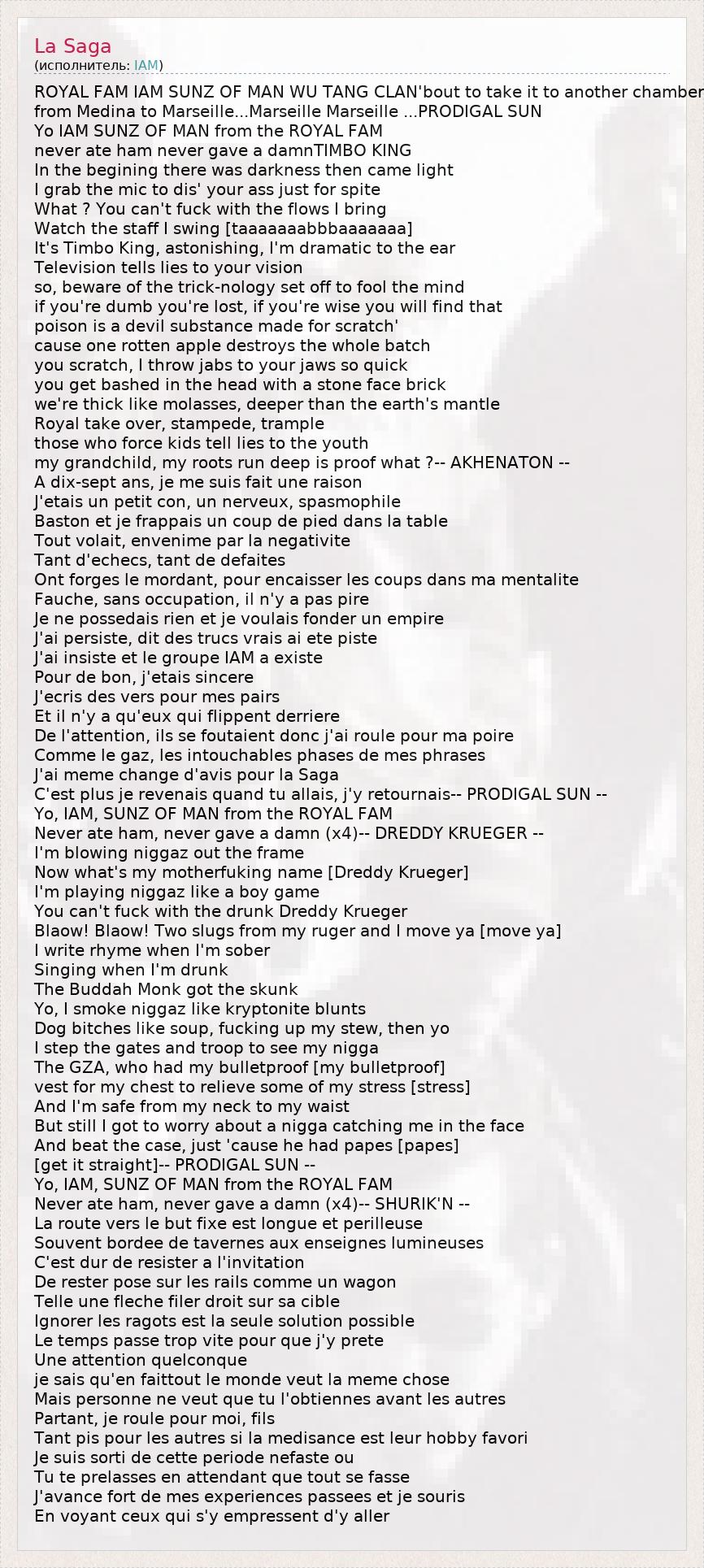 ROYAL FAM IAM SUNZ OF MAN WU TANG CLAN'bout to take it to another chamber from Medina to Marseille...Marseille Marseille ...PRODIGAL SUN Yo IAM SUNZ OF MAN from the ROYAL FAM never ate ham never gave a damnTIMBO KING In the begining there was darkness then came light I grab the mic to dis' your ass just for spite What ? You can't fuck with the flows I bring Watch the staff I swing [taaaaaaabbbaaaaaaa] It's Timbo King, astonishing, I'm dramatic to the ear Television tells lies to your vision so, beware of the trick-nology set off to fool the mind if you're dumb you're lost, if you're wise you will find that poison is a devil substance made for scratch' cause one rotten apple destroys the whole batch you scratch, I throw jabs to your jaws so quick you get bashed in the head with a stone face brick we're thick like molasses, deeper than the earth's mantle Royal take over, stampede, trample those who force kids tell lies to the youth my grandchild, my roots run deep is proof what ?-- AKHENATON -- A dix-sept ans, je me suis fait une raison J'etais un petit con, un nerveux, spasmophile Baston et je frappais un coup de pied dans la table Tout volait, envenime par la negativite Tant d'echecs, tant de defaites Ont forges le mordant, pour encaisser les coups dans ma mentalite Fauche, sans occupation, il n'y a pas pire Je ne possedais rien et je voulais fonder un empire J'ai persiste, dit des trucs vrais ai ete piste J'ai insiste et le groupe IAM a existe Pour de bon, j'etais sincere J'ecris des vers pour mes pairs Et il n'y a qu'eux qui flippent derriere De l'attention, ils se foutaient donc j'ai roule pour ma poire Comme le gaz, les intouchables phases de mes phrases J'ai meme change d'avis pour la Saga C'est plus je revenais quand tu allais, j'y retournais-- PRODIGAL SUN -- Yo, IAM, SUNZ OF MAN from the ROYAL FAM Never ate ham, never gave a damn (x4)-- DREDDY KRUEGER -- I'm blowing niggaz out the frame Now what's my motherfuking name [Dreddy Krueger] I'm playing niggaz like a boy game You can't fuck with the drunk Dreddy Krueger Blaow! Blaow! Two slugs from my ruger and I move ya [move ya] I write rhyme when I'm sober Singing when I'm drunk The Buddah Monk got the skunk Yo, I smoke niggaz like kryptonite blunts Dog bitches like soup, fucking up my stew, then yo I step the gates and troop to see my nigga The GZA, who had my bulletproof [my bulletproof] vest for my chest to relieve some of my stress [stress] And I'm safe from my neck to my waist But still I got to worry about a nigga catching me in the face And beat the case, just 'cause he had papes [papes] [get it straight]-- PRODIGAL SUN -- Yo, IAM, SUNZ OF MAN from the ROYAL FAM Never ate ham, never gave a damn (x4)-- SHURIK'N -- La route vers le but fixe est longue et perilleuse Souvent bordee de tavernes aux enseignes lumineuses C'est dur de resister a l'invitation De rester pose sur les rails comme un wagon Telle une fleche filer droit sur sa cible Ignorer les ragots est la seule solution possible Le temps passe trop vite pour que j'y prete Une attention quelconque je sais qu'en faittout le monde veut la meme chose Mais personne ne veut que tu l'obtiennes avant les autres Partant, je roule pour moi, fils Tant pis pour les autres si la medisance est leur hobby favori Je suis sorti de cette periode nefaste ou Tu te prelasses en attendant que tout se fasse J'avance fort de mes experiences passees et je souris En voyant ceux qui s'y empressent d'y aller