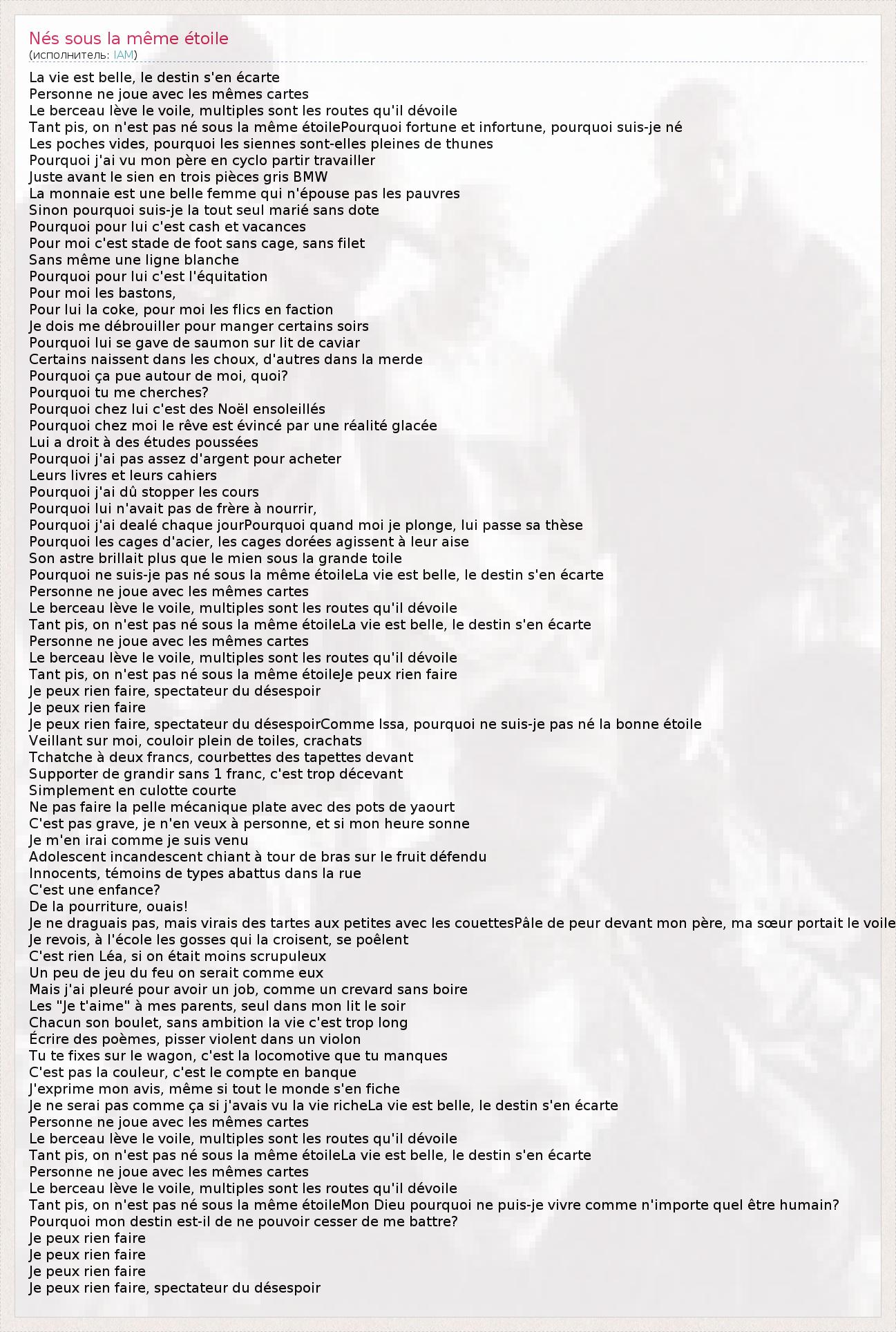 La vie est belle, le destin s'en écarte Personne ne joue avec les mêmes cartes Le berceau lève le voile, multiples sont les routes qu'il dévoile Tant pis, on n'est pas né sous la même étoilePourquoi fortune et infortune, pourquoi suis-je né Les poches vides, pourquoi les siennes sont-elles pleines de thunes Pourquoi j'ai vu mon père en cyclo partir travailler Juste avant le sien en trois pièces gris BMW La monnaie est une belle femme qui n'épouse pas les pauvres Sinon pourquoi suis-je la tout seul marié sans dote Pourquoi pour lui c'est cash et vacances Pour moi c'est stade de foot sans cage, sans filet Sans même une ligne blanche Pourquoi pour lui c'est l'équitation Pour moi les bastons, Pour lui la coke, pour moi les flics en faction Je dois me débrouiller pour manger certains soirs Pourquoi lui se gave de saumon sur lit de caviar Certains naissent dans les choux, d'autres dans la merde Pourquoi ça pue autour de moi, quoi? Pourquoi tu me cherches? Pourquoi chez lui c'est des Noël ensoleillés Pourquoi chez moi le rêve est évincé par une réalité glacée Lui a droit à des études poussées Pourquoi j'ai pas assez d'argent pour acheter Leurs livres et leurs cahiers Pourquoi j'ai dû stopper les cours Pourquoi lui n'avait pas de frère à nourrir, Pourquoi j'ai dealé chaque jourPourquoi quand moi je plonge, lui passe sa thèse Pourquoi les cages d'acier, les cages dorées agissent à leur aise Son astre brillait plus que le mien sous la grande toile Pourquoi ne suis-je pas né sous la même étoileLa vie est belle, le destin s'en écarte Personne ne joue avec les mêmes cartes Le berceau lève le voile, multiples sont les routes qu'il dévoile Tant pis, on n'est pas né sous la même étoileLa vie est belle, le destin s'en écarte Personne ne joue avec les mêmes cartes Le berceau lève le voile, multiples sont les routes qu'il dévoile Tant pis, on n'est pas né sous la même étoileJe peux rien faire Je peux rien faire, spectateur du désespoir Je peux rien faire Je peux rien faire, spectateur du désespoirComme Issa, pourquoi ne suis-je pas né la bonne étoile Veillant sur moi, couloir plein de toiles, crachats Tchatche à deux francs, courbettes des tapettes devant Supporter de grandir sans 1 franc, c'est trop décevant Simplement en culotte courte Ne pas faire la pelle mécanique plate avec des pots de yaourt C'est pas grave, je n'en veux à personne, et si mon heure sonne Je m'en irai comme je suis venu Adolescent incandescent chiant à tour de bras sur le fruit défendu Innocents, témoins de types abattus dans la rue C'est une enfance? De la pourriture, ouais! Je ne draguais pas, mais virais des tartes aux petites avec les couettesPâle de peur devant mon père, ma sœur portait le voile Je revois, à l'école les gosses qui la croisent, se poêlent C'est rien Léa, si on était moins scrupuleux Un peu de jeu du feu on serait comme eux Mais j'ai pleuré pour avoir un job, comme un crevard sans boire Les "Je t'aime" à mes parents, seul dans mon lit le soir Chacun son boulet, sans ambition la vie c'est trop long Écrire des poèmes, pisser violent dans un violon Tu te fixes sur le wagon, c'est la locomotive que tu manques C'est pas la couleur, c'est le compte en banque J'exprime mon avis, même si tout le monde s'en fiche Je ne serai pas comme ça si j'avais vu la vie richeLa vie est belle, le destin s'en écarte Personne ne joue avec les mêmes cartes Le berceau lève le voile, multiples sont les routes qu'il dévoile Tant pis, on n'est pas né sous la même étoileLa vie est belle, le destin s'en écarte Personne ne joue avec les mêmes cartes Le berceau lève le voile, multiples sont les routes qu'il dévoile Tant pis, on n'est pas né sous la même étoileMon Dieu pourquoi ne puis-je vivre comme n'importe quel être humain? Pourquoi mon destin est-il de ne pouvoir cesser de me battre? Je peux rien faire Je peux rien faire Je peux rien faire Je peux rien faire, spectateur du désespoir