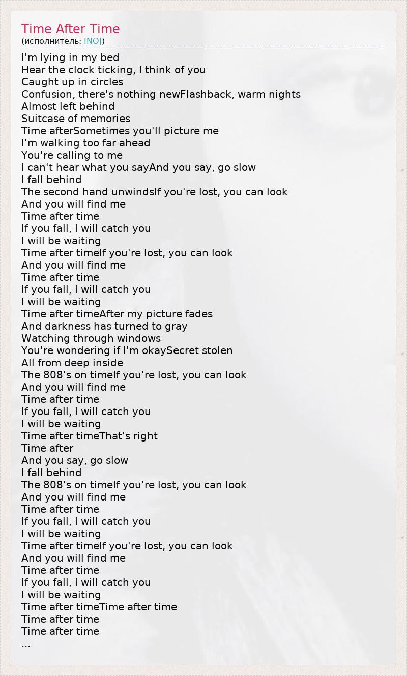 I'm lying in my bed Hear the clock ticking, I think of you Caught up in circles Confusion, there's nothing newFlashback, warm nights Almost left behind Suitcase of memories Time afterSometimes you'll picture me I'm walking too far ahead You're calling to me I can't hear what you sayAnd you say, go slow I fall behind The second hand unwindsIf you're lost, you can look And you will find me Time after time If you fall, I will catch you I will be waiting Time after timeIf you're lost, you can look And you will find me Time after time If you fall, I will catch you I will be waiting Time after timeAfter my picture fades And darkness has turned to gray Watching through windows You're wondering if I'm okaySecret stolen All from deep inside The 808's on timeIf you're lost, you can look And you will find me Time after time If you fall, I will catch you I will be waiting Time after timeThat's right Time after And you say, go slow I fall behind The 808's on timeIf you're lost, you can look And you will find me Time after time If you fall, I will catch you I will be waiting Time after timeIf you're lost, you can look And you will find me Time after time If you fall, I will catch you I will be waiting Time after timeTime after time Time after time Time after time ...
