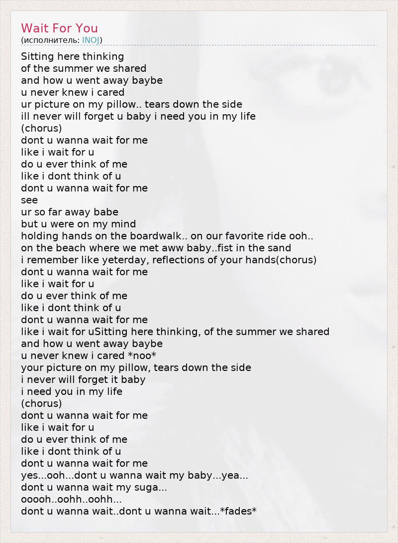 Sitting here thinking of the summer we shared and how u went away baybe u never knew i cared ur picture on my pillow.. tears down the side ill never will forget u baby i need you in my life (chorus) dont u wanna wait for me like i wait for u do u ever think of me like i dont think of u dont u wanna wait for me see ur so far away babe but u were on my mind holding hands on the boardwalk.. on our favorite ride ooh.. on the beach where we met aww baby..fist in the sand i remember like yeterday, reflections of your hands(chorus) dont u wanna wait for me like i wait for u do u ever think of me like i dont think of u dont u wanna wait for me like i wait for uSitting here thinking, of the summer we shared and how u went away baybe u never knew i cared *noo* your picture on my pillow, tears down the side i never will forget it baby i need you in my life (chorus) dont u wanna wait for me like i wait for u do u ever think of me like i dont think of u dont u wanna wait for me yes...ooh...dont u wanna wait my baby...yea... dont u wanna wait my suga... ooooh..oohh..oohh... dont u wanna wait..dont u wanna wait...*fades*