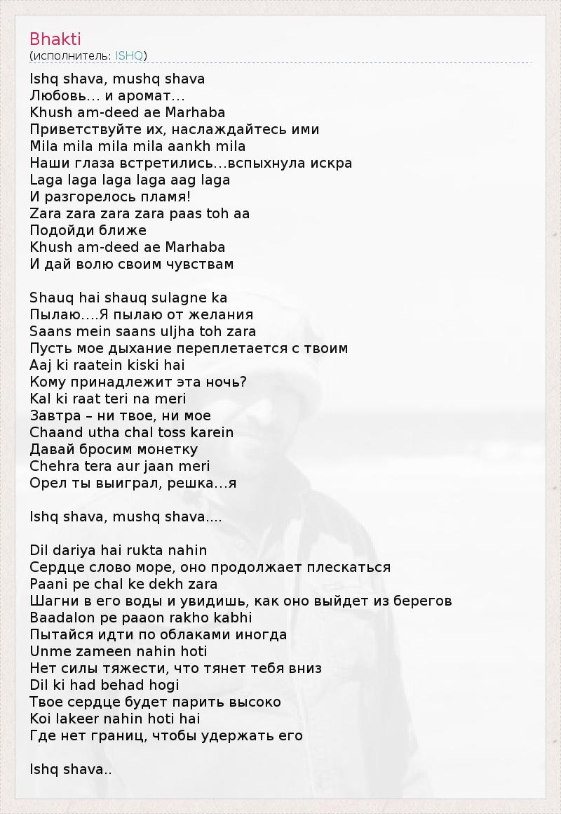 Ishq shava, mushq shava Любовь… и аромат… Khush am-deed ae Marhaba Приветствуйте их, наслаждайтесь ими Mila mila mila mila aankh mila Наши глаза встретились…вспыхнула искра Laga laga laga laga aag laga И разгорелось пламя! Zara zara zara zara paas toh aa Подойди ближе Khush am-deed ae Marhaba И дай волю своим чувствам Shauq hai shauq sulagne ka Пылаю….Я пылаю от желания Saans mein saans uljha toh zara Пусть мое дыхание переплетается с твоим Aaj ki raatein kiski hai Кому принадлежит эта ночь? Kal ki raat teri na meri Завтра – ни твое, ни мое Chaand utha chal toss karein Давай бросим монетку Chehra tera aur jaan meri Орел ты выиграл, решка…я Ishq shava, mushq shava.... Dil dariya hai rukta nahin Сердце слово море, оно продолжает плескаться Paani pe chal ke dekh zara Шагни в его воды и увидишь, как оно выйдет из берегов Baadalon pe paaon rakho kabhi Пытайся идти по облаками иногда Unme zameen nahin hoti Нет силы тяжести, что тянет тебя вниз Dil ki had behad hogi Твое сердце будет парить высоко Koi lakeer nahin hoti hai Где нет границ, чтобы удержать его Ishq shava..