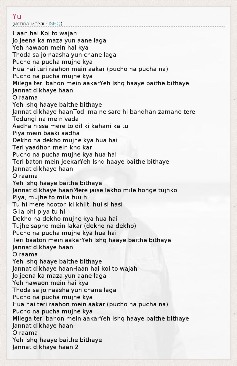 Haan hai Koi to wajah Jo jeena ka maza yun aane laga Yeh hawaon mein hai kya Thoda sa jo naasha yun chane laga Pucho na pucha mujhe kya Hua hai teri raahon mein aakar (pucho na pucha na) Pucho na pucha mujhe kya Milega teri bahon mein aakarYeh Ishq haaye baithe bithaye Jannat dikhaye haan O raama Yeh Ishq haaye baithe bithaye Jannat dikhaye haanTodi maine sare hi bandhan zamane tere Todungi na mein vada Aadha hissa mere to dil ki kahani ka tu Piya mein baaki aadha Dekho na dekho mujhe kya hua hai Teri yaadhon mein kho kar Pucho na pucha mujhe kya hua hai Teri baton mein jeekarYeh Ishq haaye baithe bithaye Jannat dikhaye haan O raama Yeh Ishq haaye baithe bithaye Jannat dikhaye haanMere jaise lakho mile honge tujhko Piya, mujhe to mila tuu hi Tu hi mere hooton ki khilti hui si hasi Gila bhi piya tu hi Dekho na dekho mujhe kya hua hai Tujhe sapno mein lakar (dekho na dekho) Pucho na pucha mujhe kya hua hai Teri baaton mein aakarYeh Ishq haaye baithe bithaye Jannat dikhaye haan O raama Yeh Ishq haaye baithe bithaye Jannat dikhaye haanHaan hai koi to wajah Jo jeena ka maza yun aane laga Yeh hawaon mein hai kya Thoda sa jo naasha yun chane laga Pucho na pucha mujhe kya Hua hai teri raahon mein aakar (pucho na pucha na) Pucho na pucha mujhe kya Milega teri bahon mein aakarYeh Ishq haaye baithe bithaye Jannat dikhaye haan O raama Yeh Ishq haaye baithe bithaye Jannat dikhaye haan 2