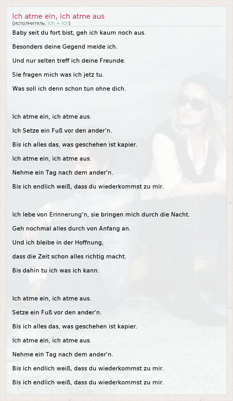 Baby seit du fort bist, geh ich kaum noch aus. Besonders deine Gegend meide ich. Und nur selten treff ich deine Freunde. Sie fragen mich was ich jetz tu. Was soll ich denn schon tun ohne dich. Ich atme ein, ich atme aus. Ich Setze ein Fuß vor den ander'n. Bis ich alles das, was geschehen ist kapier. Ich atme ein, ich atme aus. Nehme ein Tag nach dem ander'n. Bis ich endlich weiß, dass du wiederkommst zu mir. Ich lebe von Erinnerung'n, sie bringen mich durch die Nacht. Geh nochmal alles durch von Anfang an. Und ich bleibe in der Hoffnung, dass die Zeit schon alles richtig macht. Bis dahin tu ich was ich kann. Ich atme ein, ich atme aus. Setze ein Fuß vor den ander'n. Bis ich alles das, was geschehen ist kapier. Ich atme ein, ich atme aus. Nehme ein Tag nach dem ander'n. Bis ich endlich weiß, dass du wiederkommst zu mir. Bis ich endlich weiß, dass du wiederkommst zu mir.