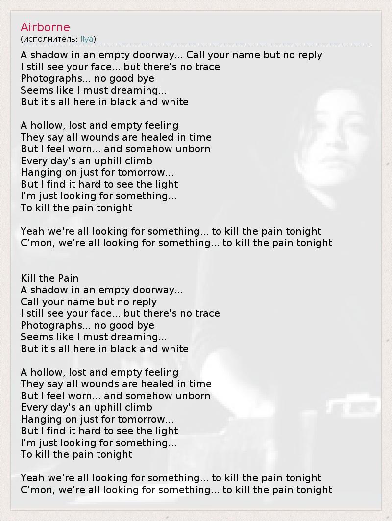 Тень в пустом дверном проеме... Зову тебя по имени, но ответа нет. Все еще вижу твое лицо... Хотя от него не осталось и следа. Фотографии... Без прощания. Кажется, что это всего лишь сон, Но все здесь в черно-белых тонах. Чувство пустоты, утраты, опустошенности... Говорят, что со временем заживают любые раны, Но я чувствую себя изнуренным и как будто нерожденным. Каждый день – восхождение в гору, И я упорствую лишь ради завтрашнего дня... Но мне тяжело смотреть на свет. Я ищу лишь то... Что уймёт боль сегодня ночью. Да, все мы ищем то... что уймёт боль сегодня ночью. О, да! Все мы ищем то... что уймёт боль сегодня ночью. Унять боль* (перевод Юрий Петриченко из Киева) Тень в пустом дверном проёме, Зову тебя - ответа нет, Вижу облик твой, хоть простыл и след, На фото ты - прощенья нет. Мне кажется, что это сон, Вокруг лишь чёрно-белый цвет... Чувство пустоты, утраты, Время лечит - говорят, Я изнурён, словно не рождён, Иду я в гору день за днём. Я разрываюсь ради завтра, Быть может, я очнусь в раю. Ищу я то, что сможет ночью, Унять лишь боль мою! Да, ищу я то, что сможет ночью, Унять лишь боль мою! * поэтический перевод с элементами творческой интерпретации