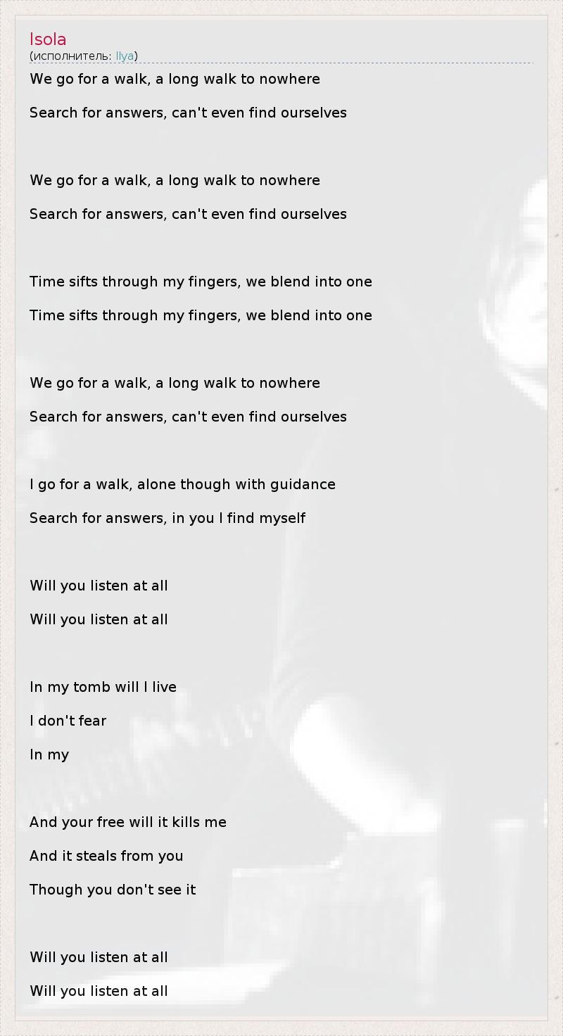 We go for a walk, a long walk to nowhere Search for answers, can't even find ourselves We go for a walk, a long walk to nowhere Search for answers, can't even find ourselves Time sifts through my fingers, we blend into one Time sifts through my fingers, we blend into one We go for a walk, a long walk to nowhere Search for answers, can't even find ourselves I go for a walk, alone though with guidance Search for answers, in you I find myself Will you listen at all Will you listen at all In my tomb will I live I don't fear In my And your free will it kills me And it steals from you Though you don't see it Will you listen at all Will you listen at all