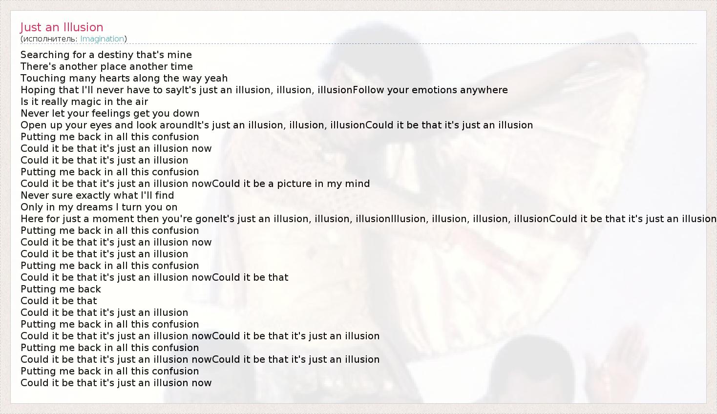 Searching for a destiny that's mine There's another place another time Touching many hearts along the way yeah Hoping that I'll never have to sayIt's just an illusion, illusion, illusionFollow your emotions anywhere Is it really magic in the air Never let your feelings get you down Open up your eyes and look aroundIt's just an illusion, illusion, illusionCould it be that it's just an illusion Putting me back in all this confusion Could it be that it's just an illusion now Could it be that it's just an illusion Putting me back in all this confusion Could it be that it's just an illusion nowCould it be a picture in my mind Never sure exactly what I'll find Only in my dreams I turn you on Here for just a moment then you're goneIt's just an illusion, illusion, illusionIllusion, illusion, illusion, illusionCould it be that it's just an illusion Putting me back in all this confusion Could it be that it's just an illusion now Could it be that it's just an illusion Putting me back in all this confusion Could it be that it's just an illusion nowCould it be that Putting me back Could it be that Could it be that it's just an illusion Putting me back in all this confusion Could it be that it's just an illusion nowCould it be that it's just an illusion Putting me back in all this confusion Could it be that it's just an illusion nowCould it be that it's just an illusion Putting me back in all this confusion Could it be that it's just an illusion now