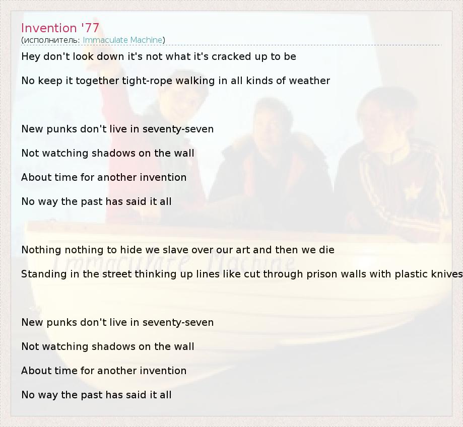 Hey don't look down it's not what it's cracked up to be No keep it together tight-rope walking in all kinds of weather New punks don't live in seventy-seven Not watching shadows on the wall About time for another invention No way the past has said it all Nothing nothing to hide we slave over our art and then we die Standing in the street thinking up lines like cut through prison walls with plastic knives New punks don't live in seventy-seven Not watching shadows on the wall About time for another invention No way the past has said it all