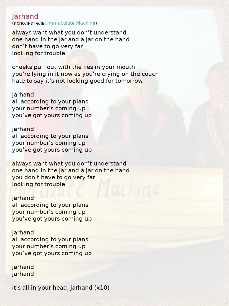 always want what you don't understand one hand in the jar and a jar on the hand don't have to go very far looking for trouble cheeks puff out with the lies in your mouth you're lying in it now as you're crying on the couch hate to say it's not looking good for tomorrow jarhand all according to your plans your number's coming up you've got yours coming up jarhand all according to your plans your number's coming up you've got yours coming up always want what you don't understand one hand in the jar and a jar on the hand you don't have to go very far looking for trouble jarhand all according to your plans your number's coming up you've got yours coming up jarhand all according to your plans your number's coming up you've got yours coming up jarhand jarhand it's all in your head, jarhand (x10)