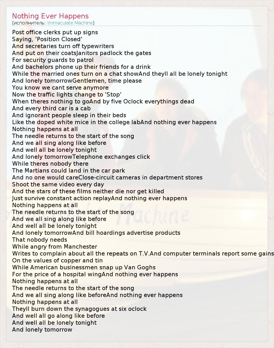 Post office clerks put up signs Saying, 'Position Closed' And secretaries turn off typewriters And put on their coatsJanitors padlock the gates For security guards to patrol And bachelors phone up their friends for a drink While the married ones turn on a chat showAnd theyll all be lonely tonight And lonely tomorrowGentlemen, time please You know we cant serve anymore Now the traffic lights change to 'Stop' When theres nothing to goAnd by five Oclock everythings dead And every third car is a cab And ignorant people sleep in their beds Like the doped white mice in the college labAnd nothing ever happens Nothing happens at all The needle returns to the start of the song And we all sing along like before And well all be lonely tonight And lonely tomorrowTelephone exchanges click While theres nobody there The Martians could land in the car park And no one would careClose-circuit cameras in department stores Shoot the same video every day And the stars of these films neither die nor get killed Just survive constant action replayAnd nothing ever happens Nothing happens at all The needle returns to the start of the song And we all sing along like before And well all be lonely tonight And lonely tomorrowAnd bill hoardings advertise products That nobody needs While angry from Manchester Writes to complain about all the repeats on T.V.And computer terminals report some gains On the values of copper and tin While American businessmen snap up Van Goghs For the price of a hospital wingAnd nothing ever happens Nothing happens at all The needle returns to the start of the song And we all sing along like beforeAnd nothing ever happens Nothing happens at all Theyll burn down the synagogues at six oclock And well all go along like before And well all be lonely tonight And lonely tomorrow