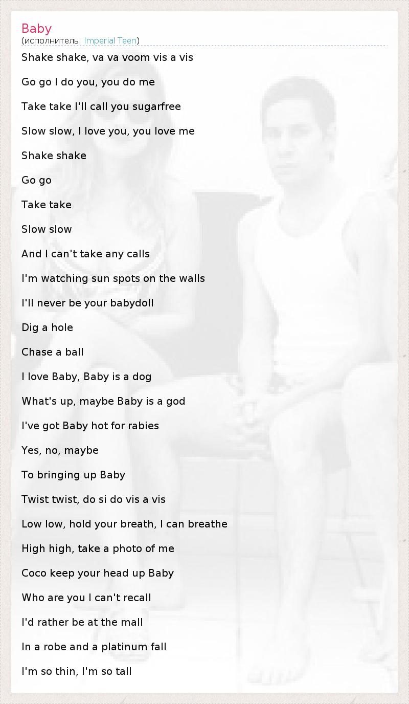 Shake shake, va va voom vis a vis Go go I do you, you do me Take take I'll call you sugarfree Slow slow, I love you, you love me Shake shake Go go Take take Slow slow And I can't take any calls I'm watching sun spots on the walls I'll never be your babydoll Dig a hole Chase a ball I love Baby, Baby is a dog What's up, maybe Baby is a god I've got Baby hot for rabies Yes, no, maybe To bringing up Baby Twist twist, do si do vis a vis Low low, hold your breath, I can breathe High high, take a photo of me Coco keep your head up Baby Who are you I can't recall I'd rather be at the mall In a robe and a platinum fall I'm so thin, I'm so tall